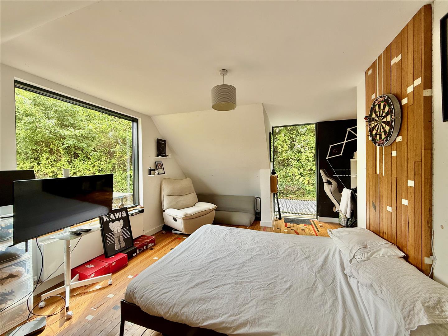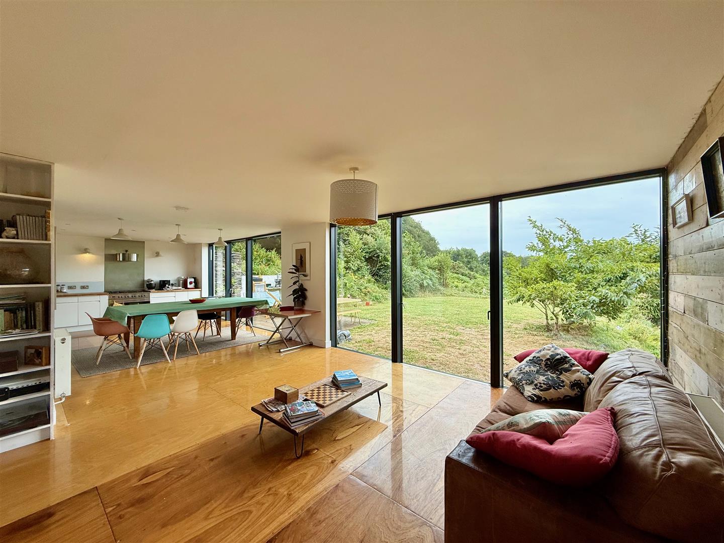 A dual aspect room with a window to the rear elevation plus a glass door providing access to outside onto a side decking area. Reclaimed sports hall oak flooring.