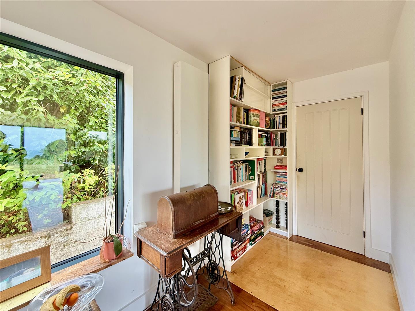 A dual aspect room with a windows to the side and rear elevations. Views over the garden and garden building from the rear. Reclaimed sports hall oak flooring.