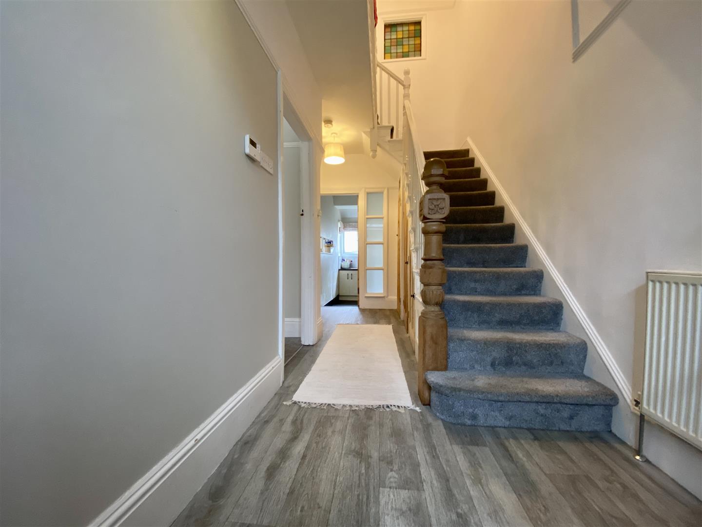 Grey wood-effect vinyl flooring. Staircase rising to the first floor landing with three storage cupboards under, one of which acts as a utility cupboard with plumbing for a washing machine. Doors leading off to the lounge, dining room and kitchen.