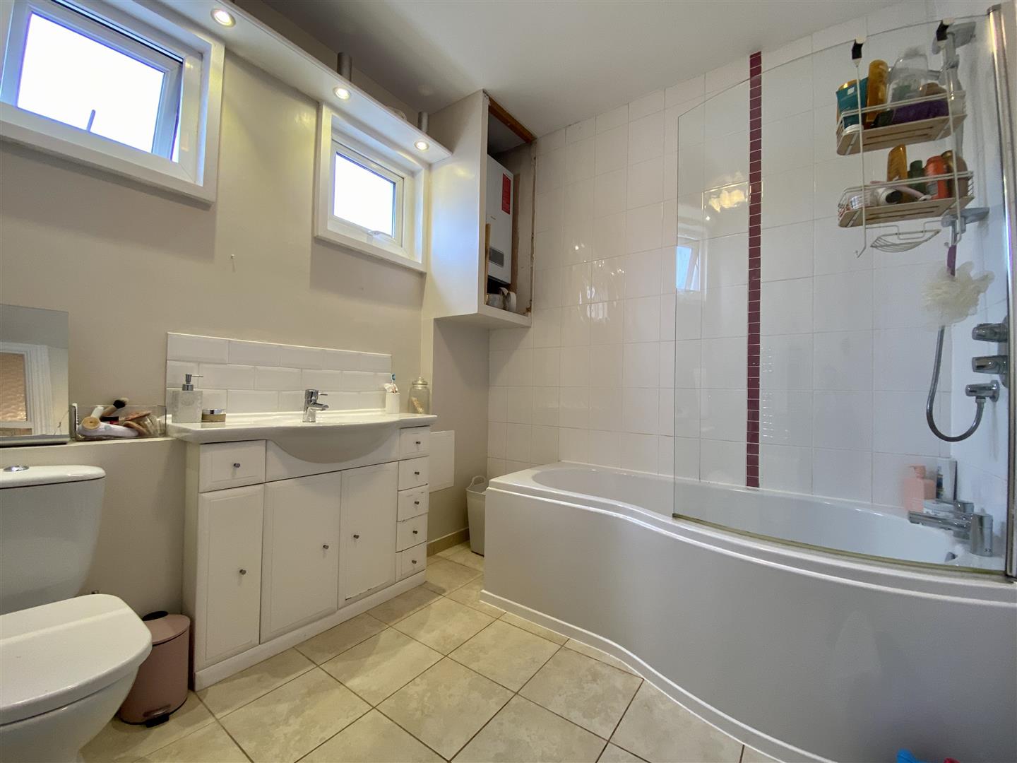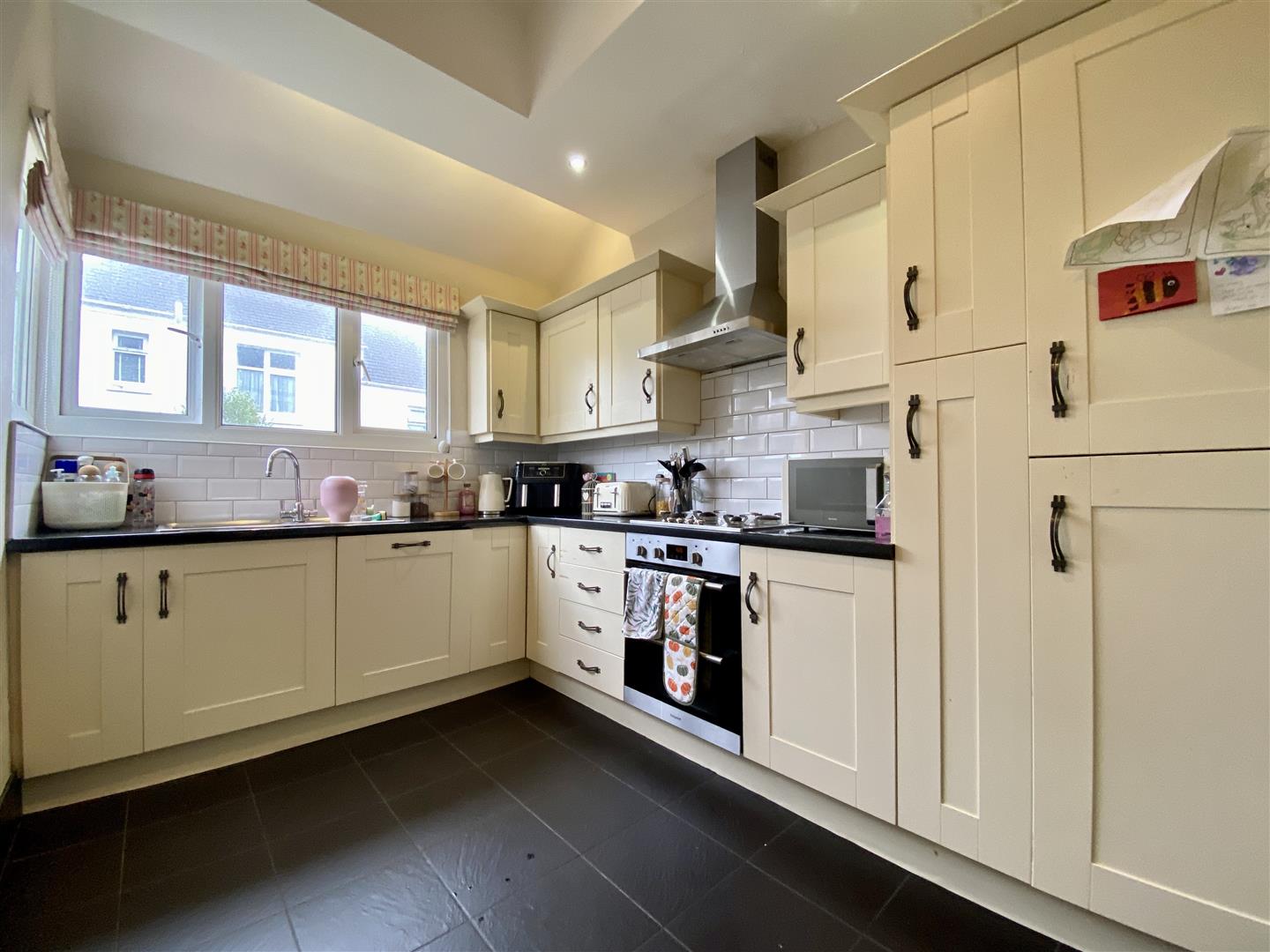 Matching base and wall-mounted units with integrated fridge-freezer, double oven and dishwasher. Rolled-edge laminate work surface. Inset 4-ring gas hob with stainless-steel extractor hood over. White brick stye splash-back. uPVC double glazed window to the rear. Tiled floor. Inset ceiling spotlights.