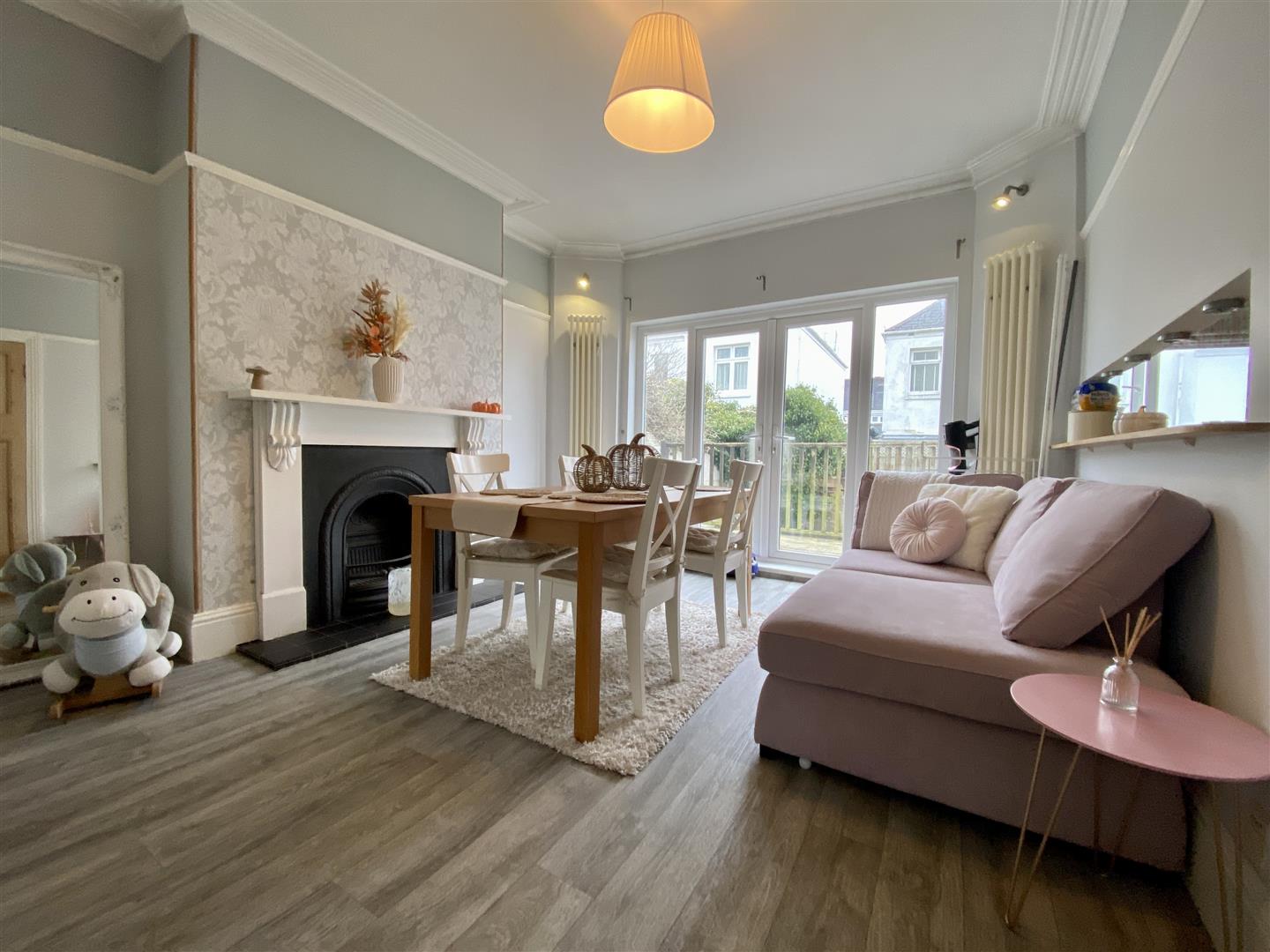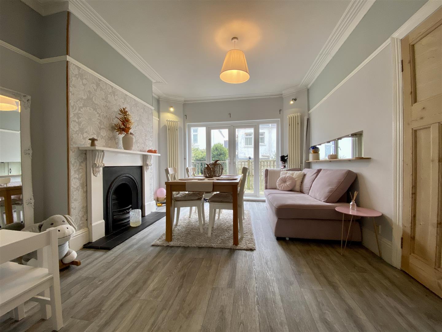 Feature fireplace with wood mantel, surround and cast iron inset with an open grate. Covings. Picture rail. uPVC double-glazed French doors open out to the rear garden. Grey wood-effect vinyl flooring.