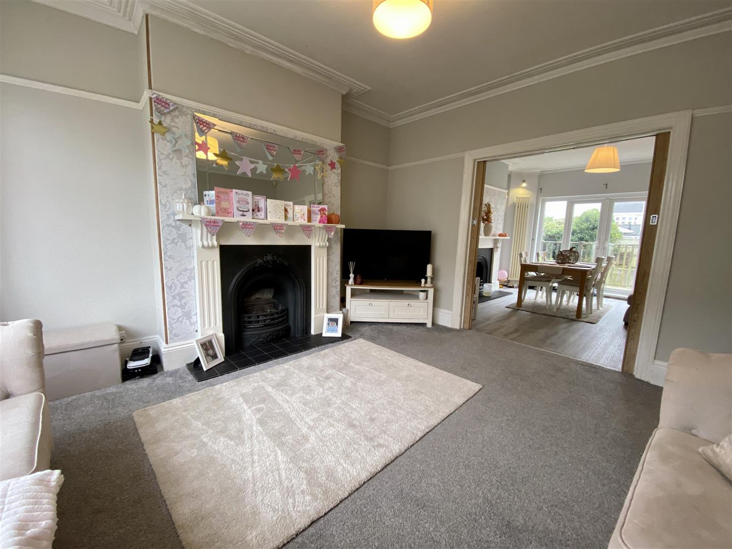 Feature fireplace with wood mantel, surround, cast iron inset with a 'Living Flame' gas fire. Picture rail. Covings. uPVC double-glazed bay window to the front. Sliding wooden doors open into;