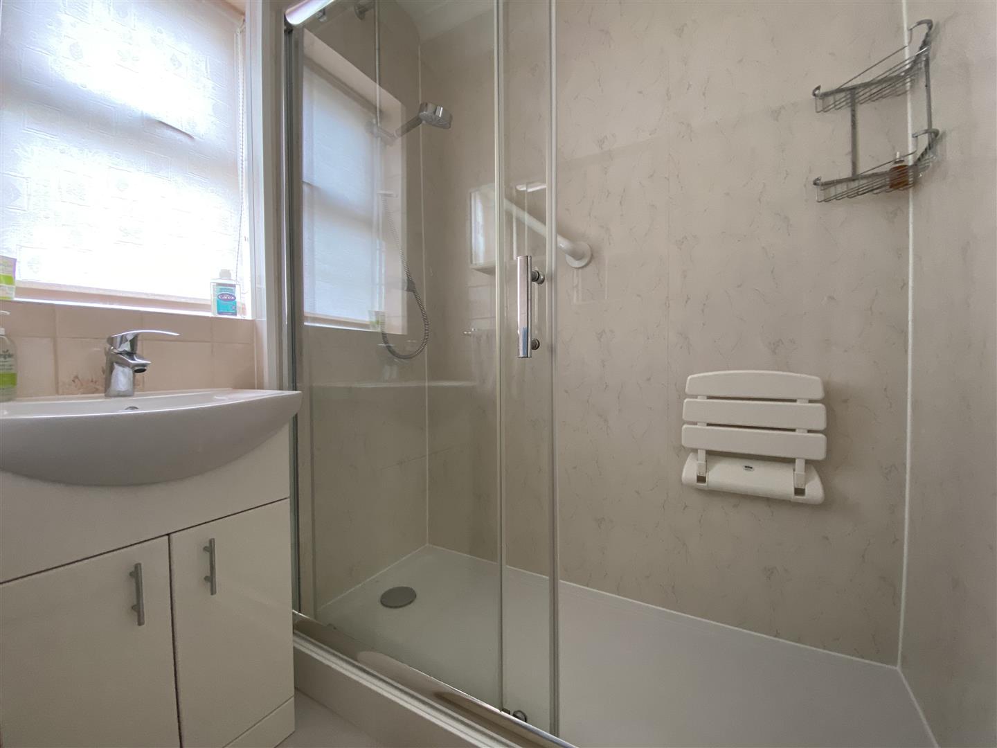 Twin shower cubical with fitted seat. Dual shower-heads both rainfall & handheld. Wash hand basin inset into vanity storage cupboards below. Obscured uPVC double-glazed window to the side.