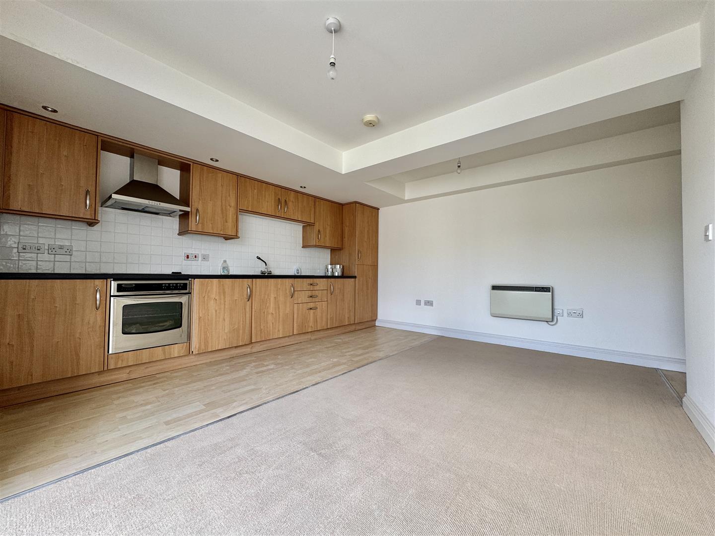 Matching base & wall mounted units to include fitted oven, integrated washing machine/dryer & integrated fridge. Roll edge laminate work surfaces have inset 4 ring electric hob with extractor hood over, stainless steel single drainer sink unit with mixer tap. Tiled splash-back. Ceiling spotlights. Laminate wood flooring. Lounge/diner area is carpeted. uPVC double-glazed window to the one side with Juliette balcony. Two Dimplex wall mounted heaters.