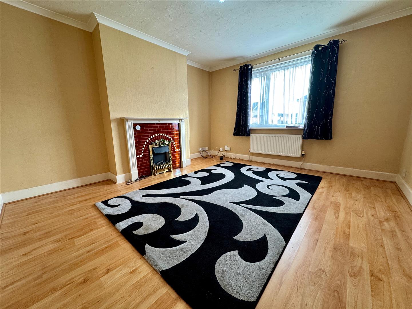 Feature fireplace with wooden mantle & surround. Tiled inset & electric fan fire. Laminate wood flooring. uPVC double-glazed window to the front. Covings.