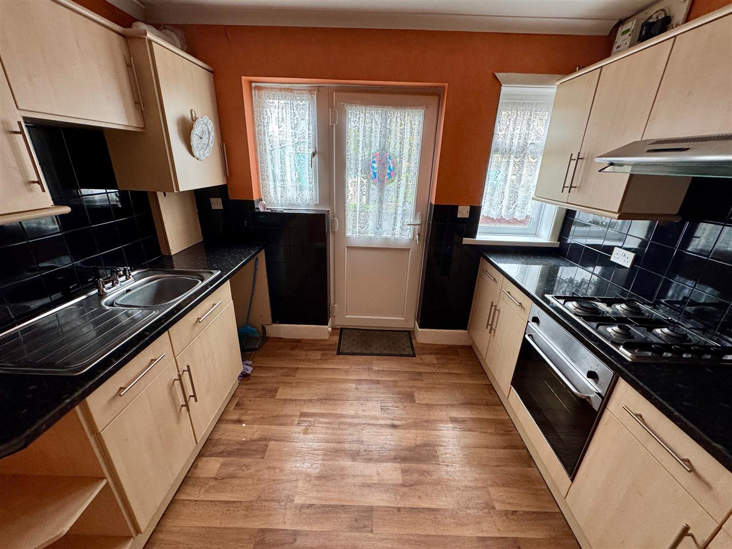 Matching base & wall mounted units to include a fitted oven, space for a washing machine & upright fridge/freezer. Roll edge laminate work surfaces have inset 4 ring gas hob & stainless steel single drainer sink unit with mixer tap. Tiled splash-back. Fitted filter hood. Wall mounted Worcester boiler is concealed in a cupboard. Two uPVC double-glazed windows to the rear. uPVC double-glazed door opens to the rear garden. Wood effect vinyl flooring.