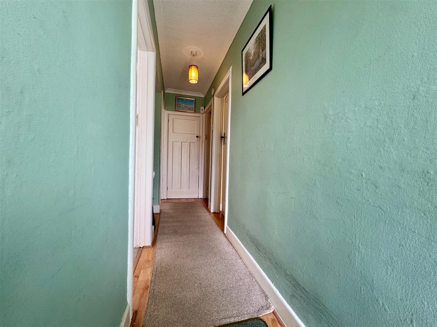 Laminate wood flooring. Doors leading through to the lounge, bedrooms, wet room and kitchen. There is a storage recess.