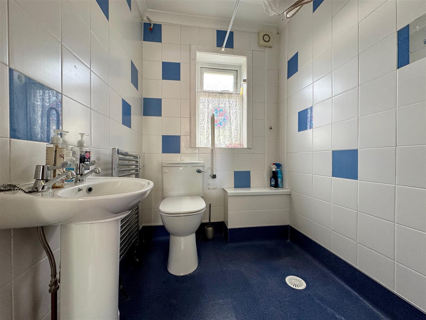 Pedestal wash hand basin. Close coupled wc. Electric Bristan shower. Tiled walls. Waterproof flooring. Obscured uPVC double-glazed window to the rear. Chrome heated towel rail. Extractor fan.