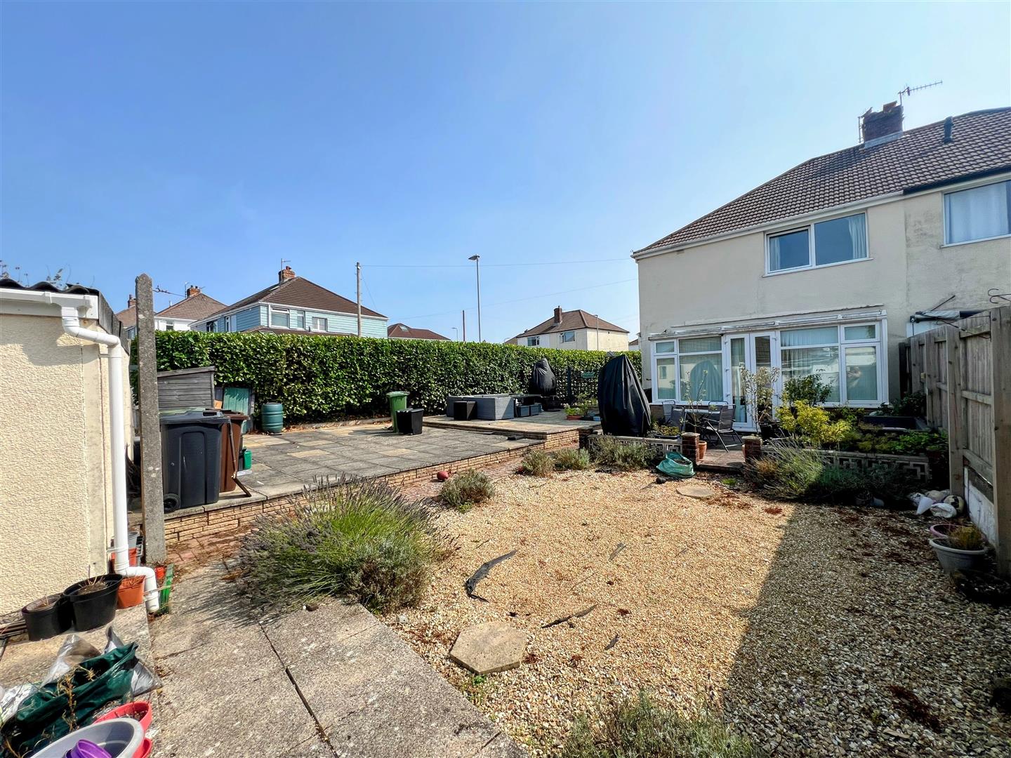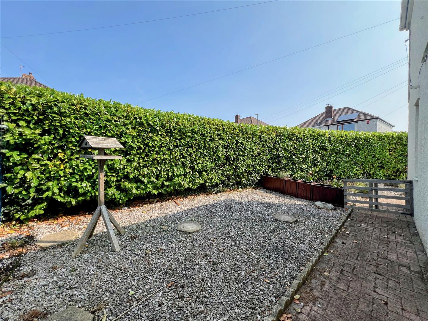 The property is approached via a metal gate into the front garden, which is laid to stone chippings, bordered by mature hedging. A brick path leads to the front door and continues around the side of the property. A wooden gate opens to the side garden which is also laid to stone chippings. A further wooden gate leads to the rear garden. The rear garden is a generous, westerly-facing garden which wraps around to the side. It is fully-enclosed by a fence, a wall and mature bushes, predominantly paved, with a small area of stone chippings. Wooden, lockable bin store. Wooden gate providing access to the garage.