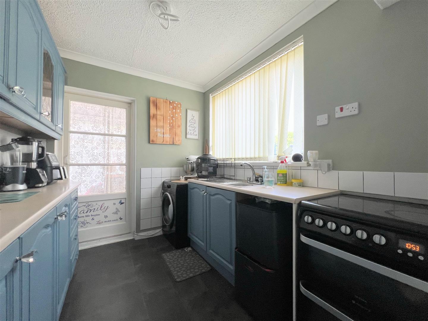 Range of matching base and wall-mounted units incorporating a roll-edged laminate worktop with a stainless-steel sink unit. Spaces for an oven and washing machine. uPVC double-glazed window to the side elevation. Wooden door, with inset glass panels, leading into the conservatory.