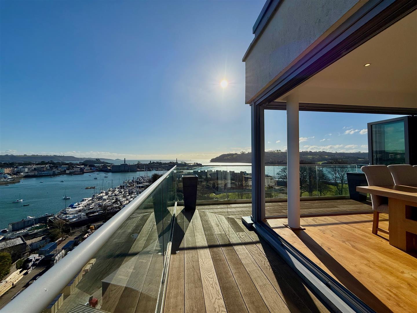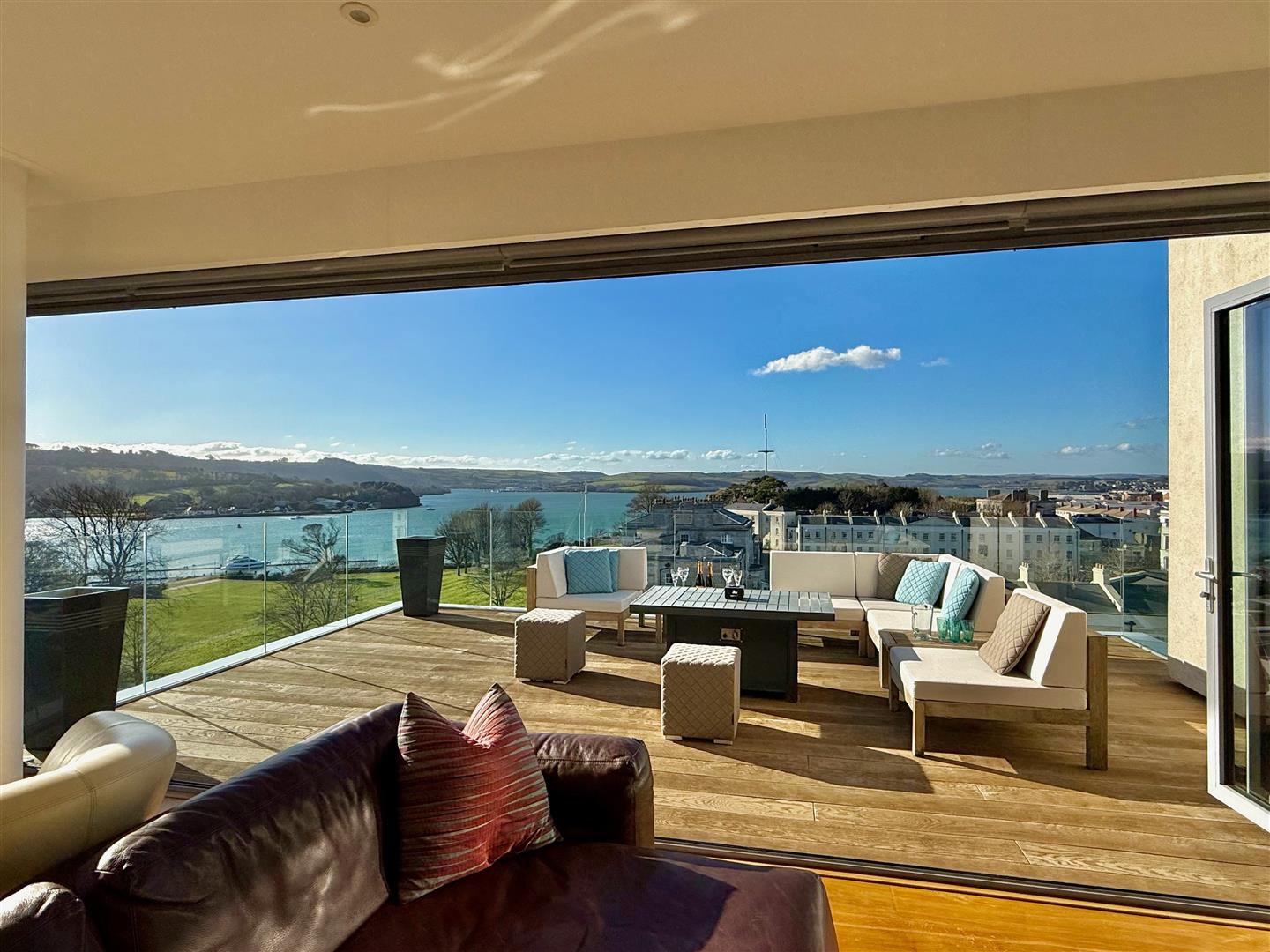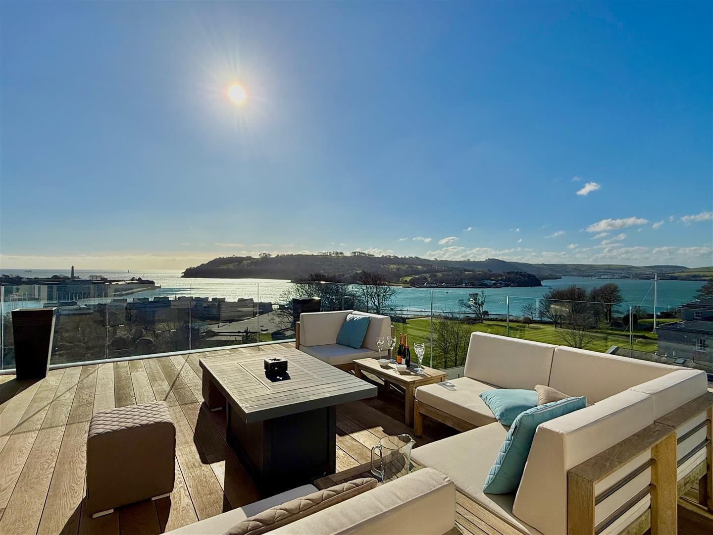 A stunning outdoor terrace with composite decking and enclosed by a glass balustrade. Fantastic views with a south-westerly aspect.