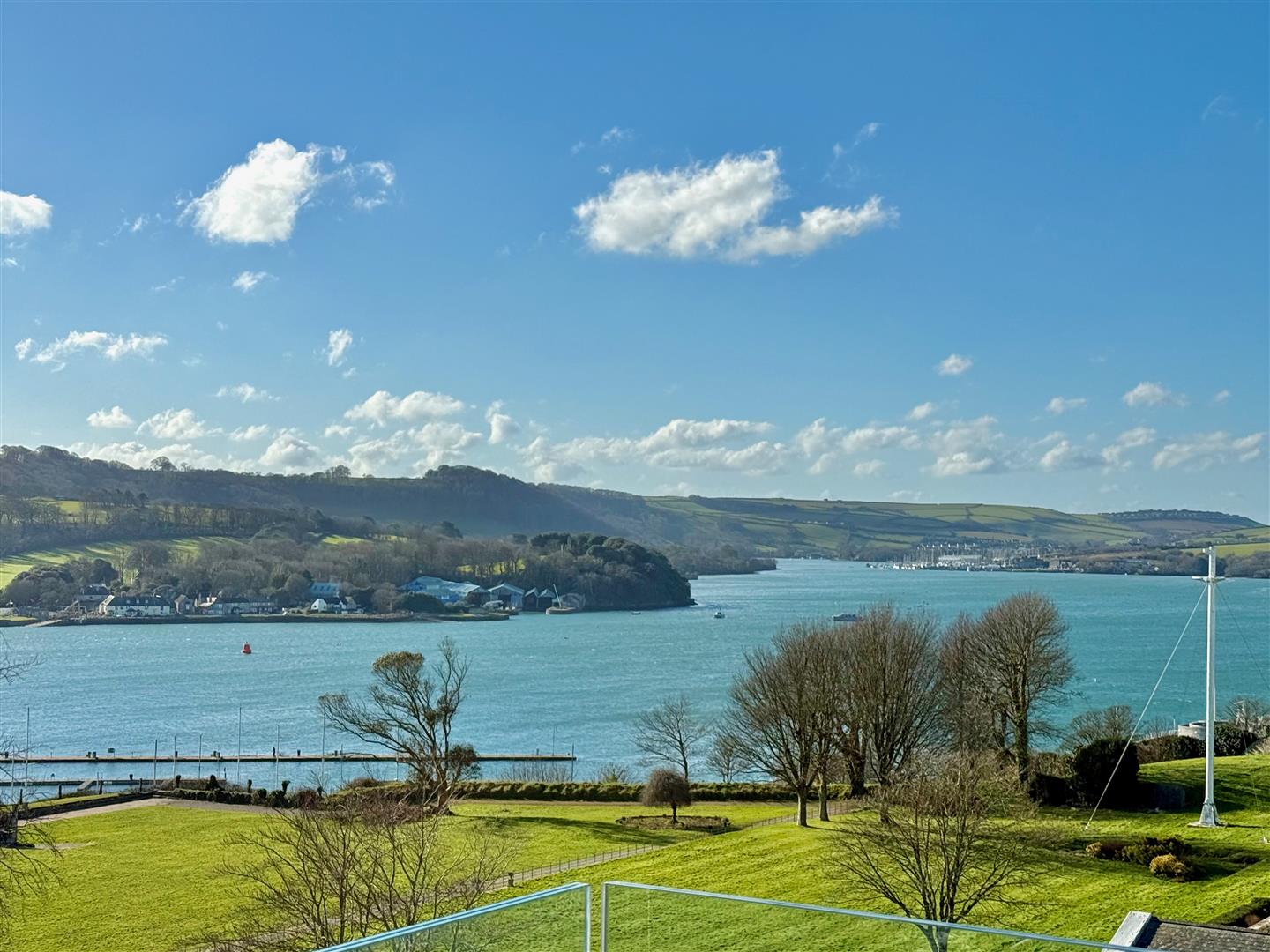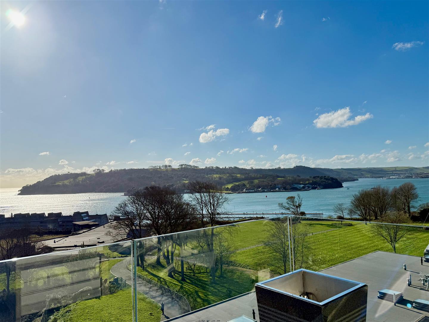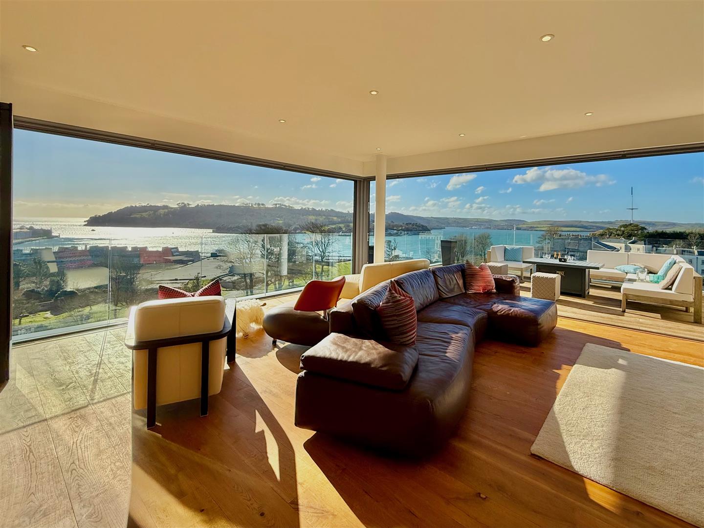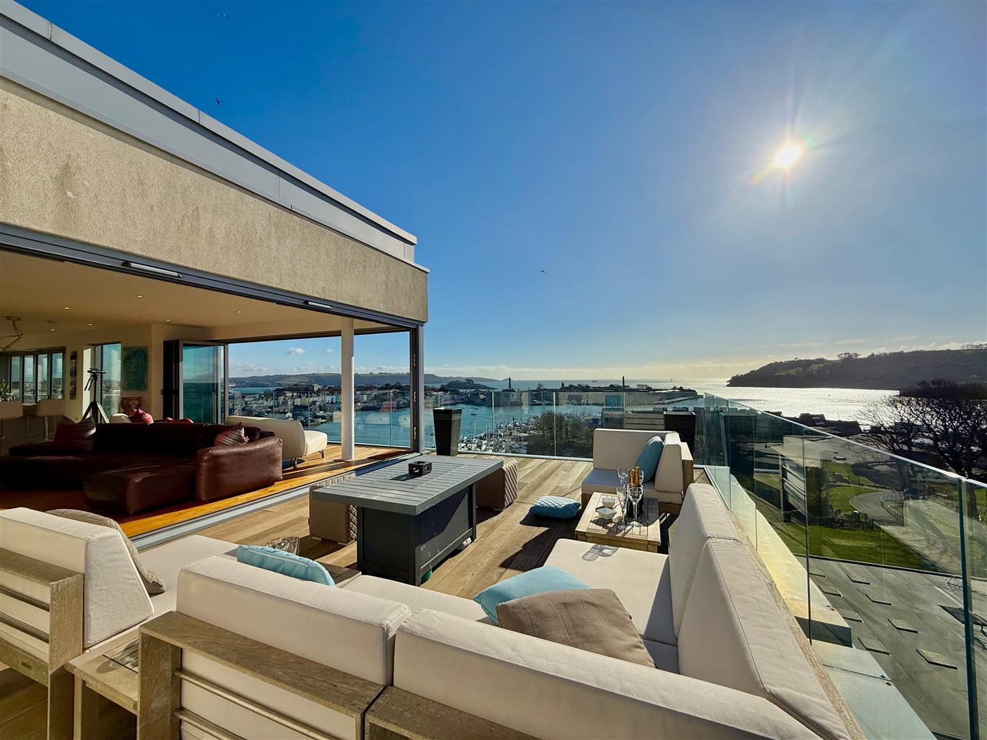 A stunning outdoor terrace with composite decking and enclosed by a glass balustrade. Fantastic views with a south-westerly aspect.
