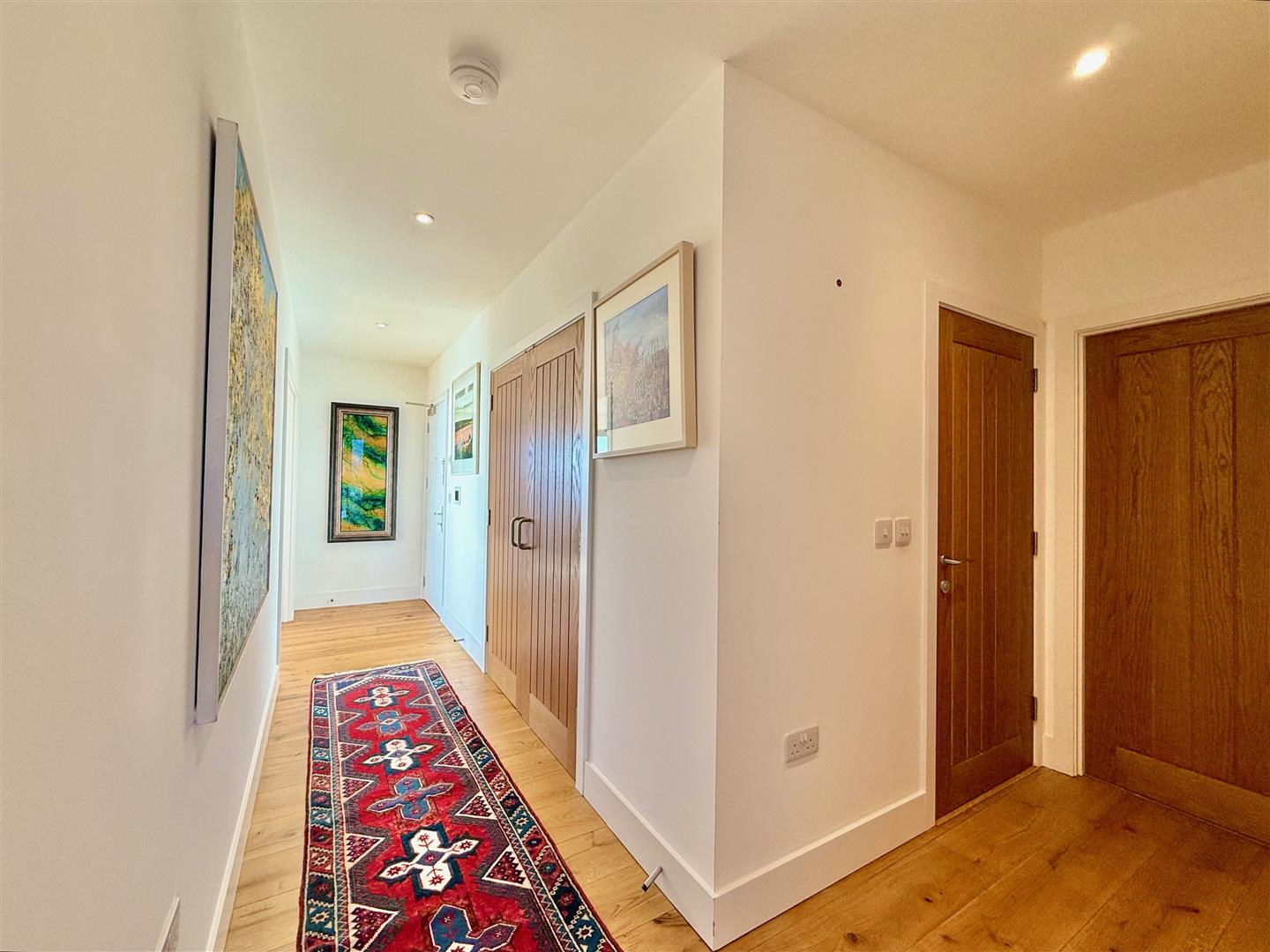 Double doors opening to a large storage cupboard with shelving and plumbing for a washing and also housing the boiler and consumer unit. Oak flooring. Underfloor heating. Inset ceiling spotlights. Double-glazed double doors opening into the living space.