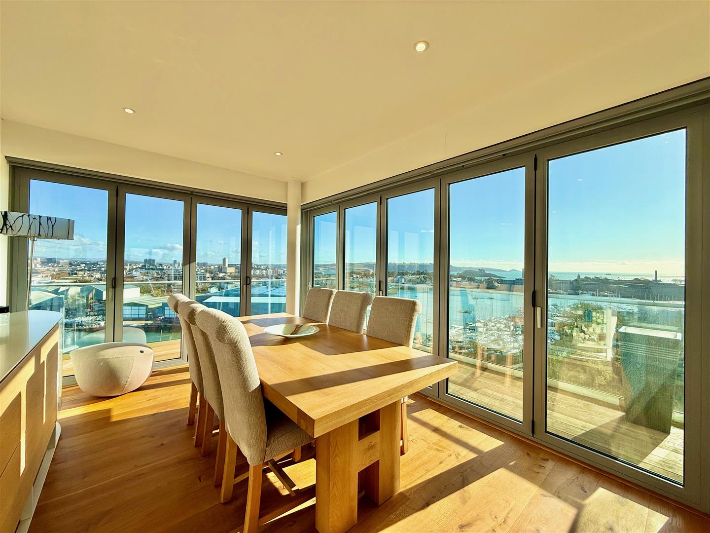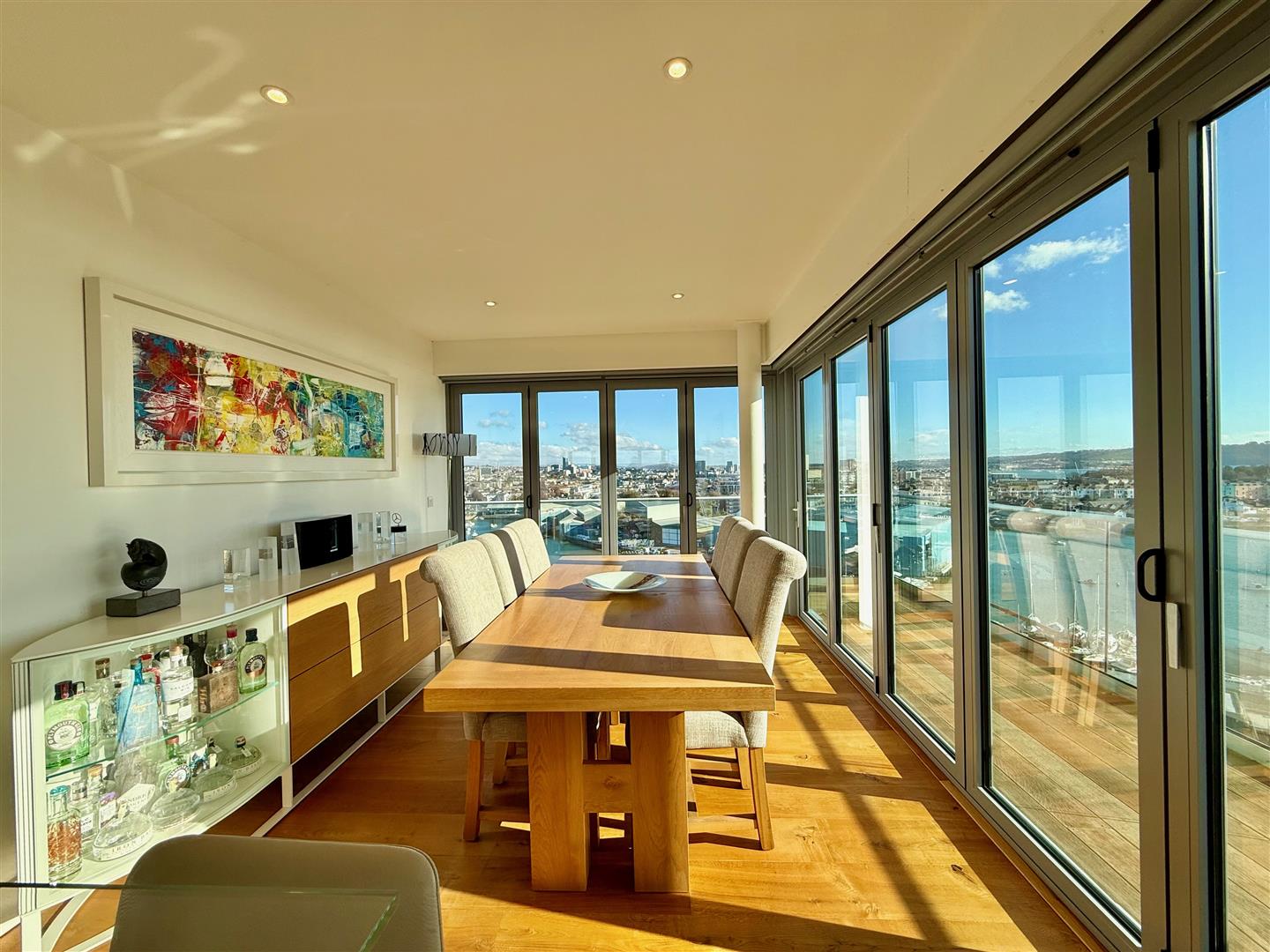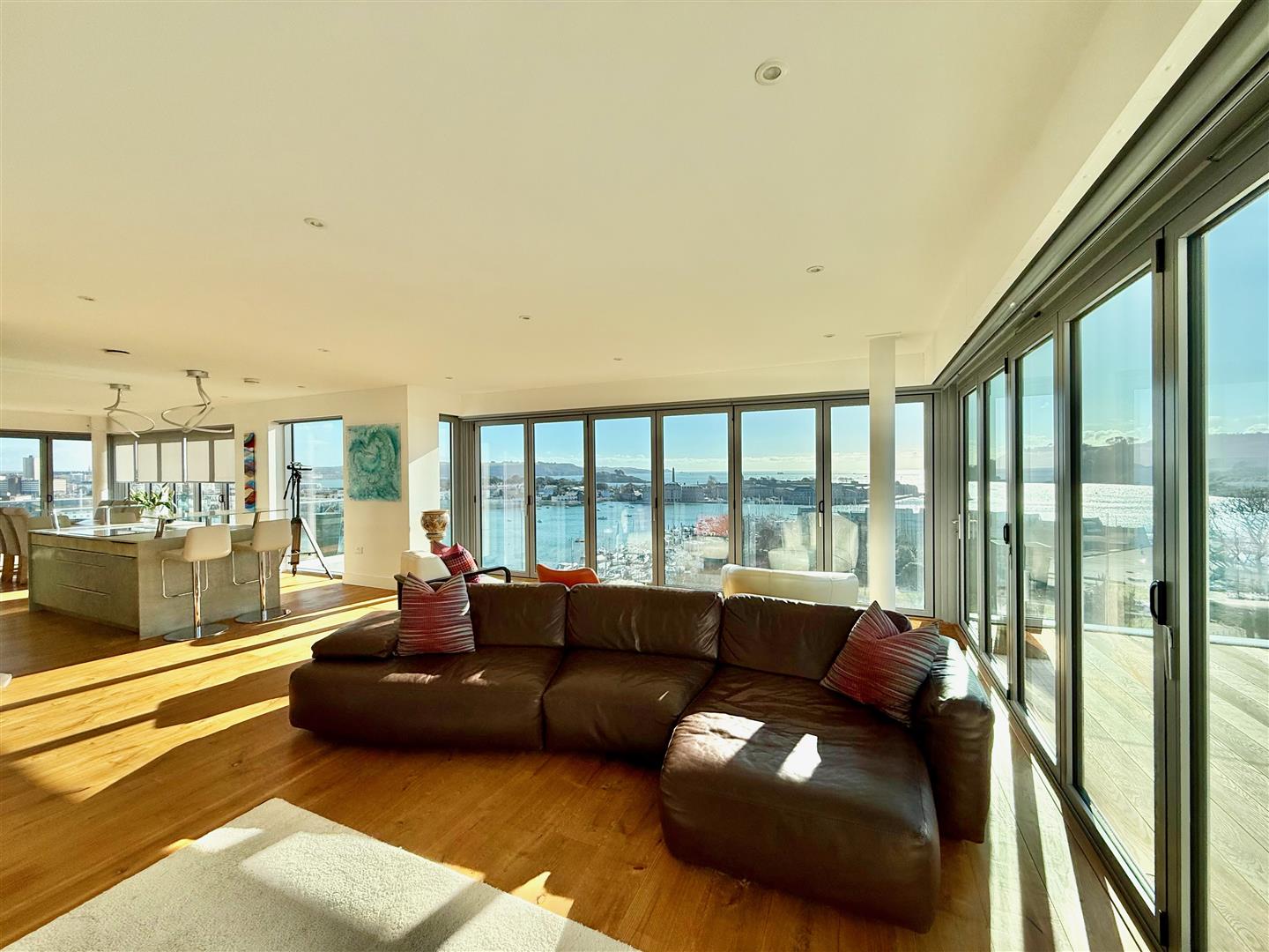 A stunning open-plan triple aspect south-westerly facing room to include 4 sets of bi-folding doors opening onto balconies plus the stunning outdoor terrace. From the room there are panoramic views of Plymouth, Staddon Heights, the Royal William Yard, Dartmoor, Plymouth Sound, the Tamar, Mount Edgecumbe and the Cornish coastline. There is oak flooring throughout and underfloor heating. There is a large lounge area, a dining area and a bespoke Ralph Winter fitted kitchen with a matching island. The kitchen is fitted with a range of matching cabinets and work surfaces. 2 glass breakfast bars. High-end appliances including a Gaggenau hob with an electronic extractor, built-in Gaggenau ovens and microwave plus plate warmer. Inset sink with a mixer tap and a Quooker boiling tap. Integral Gaggenau dishwasher. Integral fridge-freezer. Integral drinks fridge. Within the dining area there is ample space for dining table and chairs and bi-folding doors to 2 elevations opening onto a balcony with LED lighting, a glass balustrade and fabulous views.