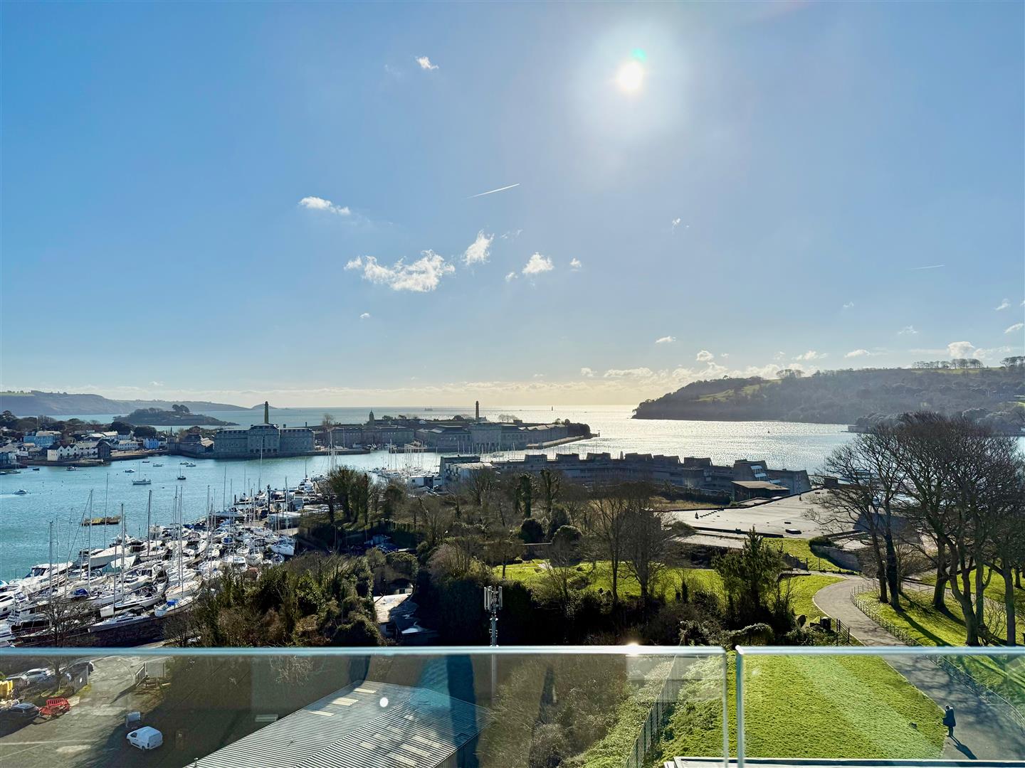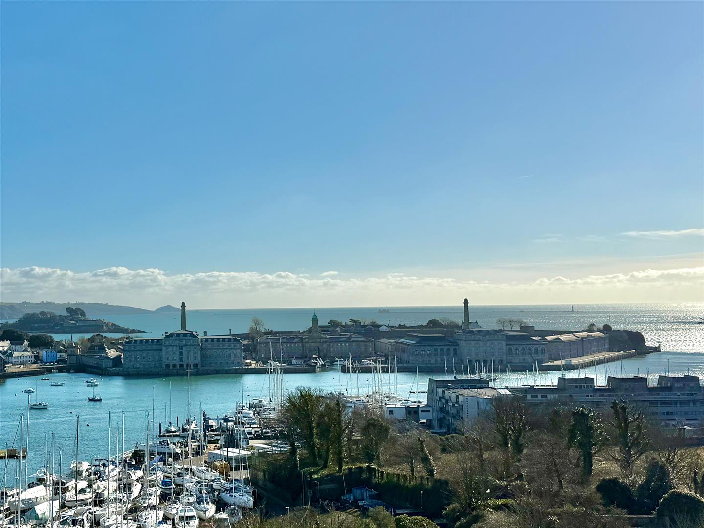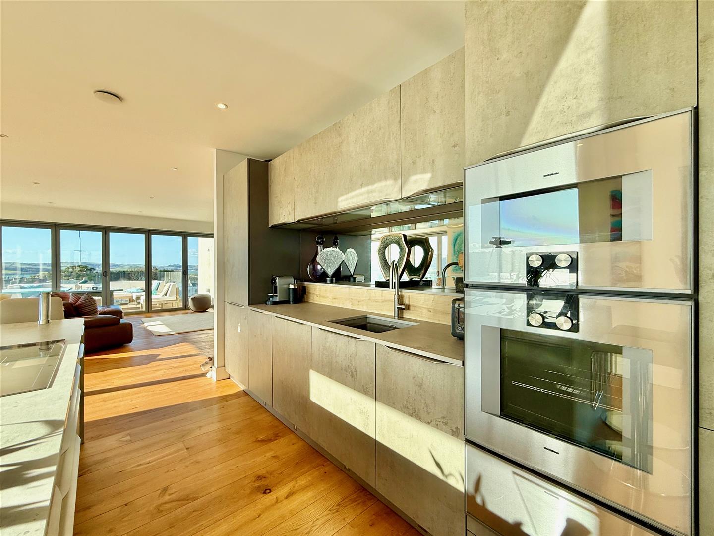A stunning open-plan triple aspect south-westerly facing room to include 4 sets of bi-folding doors opening onto balconies plus the stunning outdoor terrace. From the room there are panoramic views of Plymouth, Staddon Heights, the Royal William Yard, Dartmoor, Plymouth Sound, the Tamar, Mount Edgecumbe and the Cornish coastline. There is oak flooring throughout and underfloor heating. There is a large lounge area, a dining area and a bespoke Ralph Winter fitted kitchen with a matching island. The kitchen is fitted with a range of matching cabinets and work surfaces. 2 glass breakfast bars. High-end appliances including a Gaggenau hob with an electronic extractor, built-in Gaggenau ovens and microwave plus plate warmer. Inset sink with a mixer tap and a Quooker boiling tap. Integral Gaggenau dishwasher. Integral fridge-freezer. Integral drinks fridge. Within the dining area there is ample space for dining table and chairs and bi-folding doors to 2 elevations opening onto a balcony with LED lighting, a glass balustrade and fabulous views.