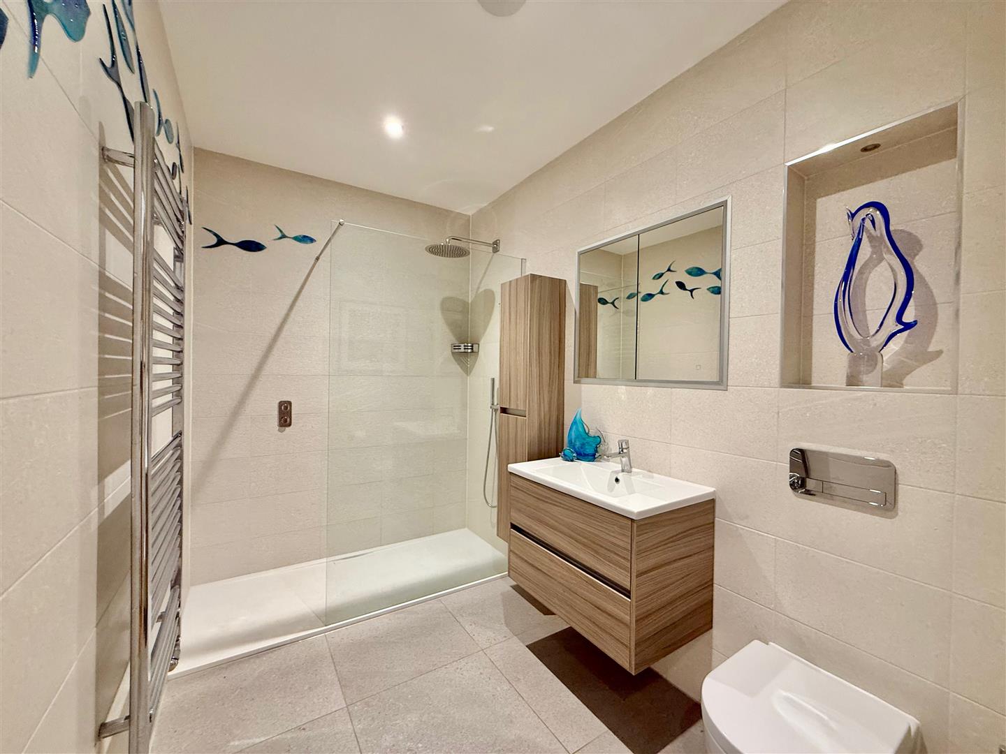 Comprising a large walk-in shower with fixed glass screen, wall-mounted controls, over-head shower plus an additional rinsing attachment, large basin with drawer storage beneath and wall-mounted wc with a concealed cistern and a push-button flush. Chrome towel rail/radiator. Wall-mounted cabinet. Recessed mirrored bathroom cabinet with integral lighting. Fully-tiled walls. Tiled floor. Inset ceiling spotlights.