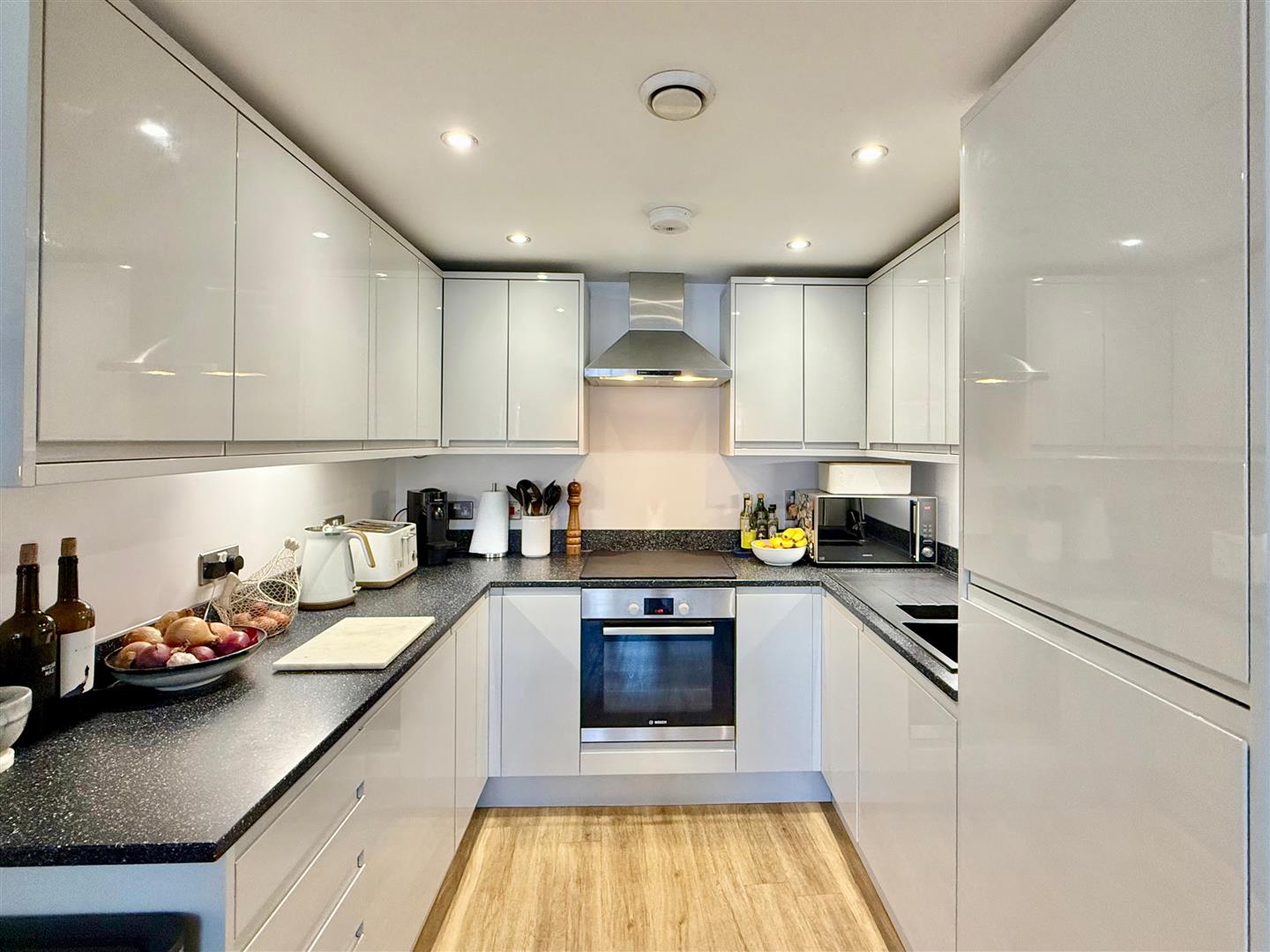 A spacious room with ample space for seating and dining. There are 2 sash windows to the front elevation. The kitchen area is fitted with a range of modern base and wall-mounted cabinets with light grey gloss fascias contrasted by darker work surfaces with matching splash-backs. Inset one-&-a-half bowl single drainer sink unit. Built-in Bosch oven. Inset electric hob with a cooker hood above. Integral fridge and freezer. Integral dishwasher. Inset ceiling spotlights.