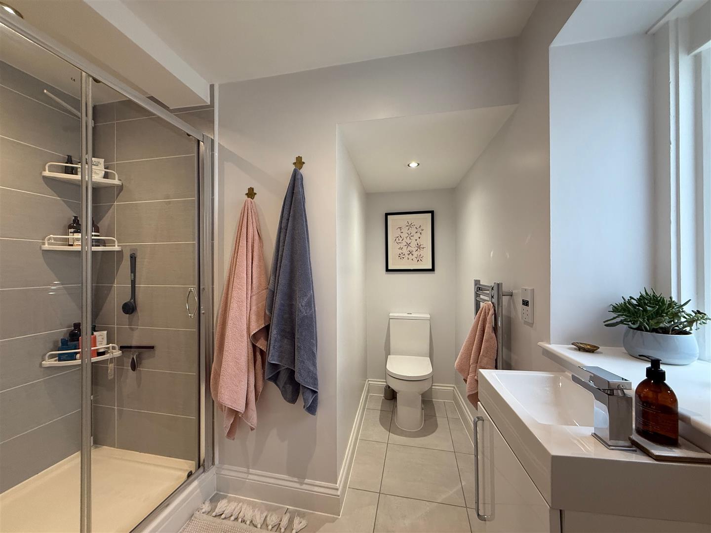 An 'L-shaped' room. Comprising a large enclosed tiled shower with wall-mounted controls, rainfall shower head and sliding glass door, wc and wash hand basin with a cupboard beneath. Chrome towel rail/radiator. Tiled floor. Obscured window to the side elevation.