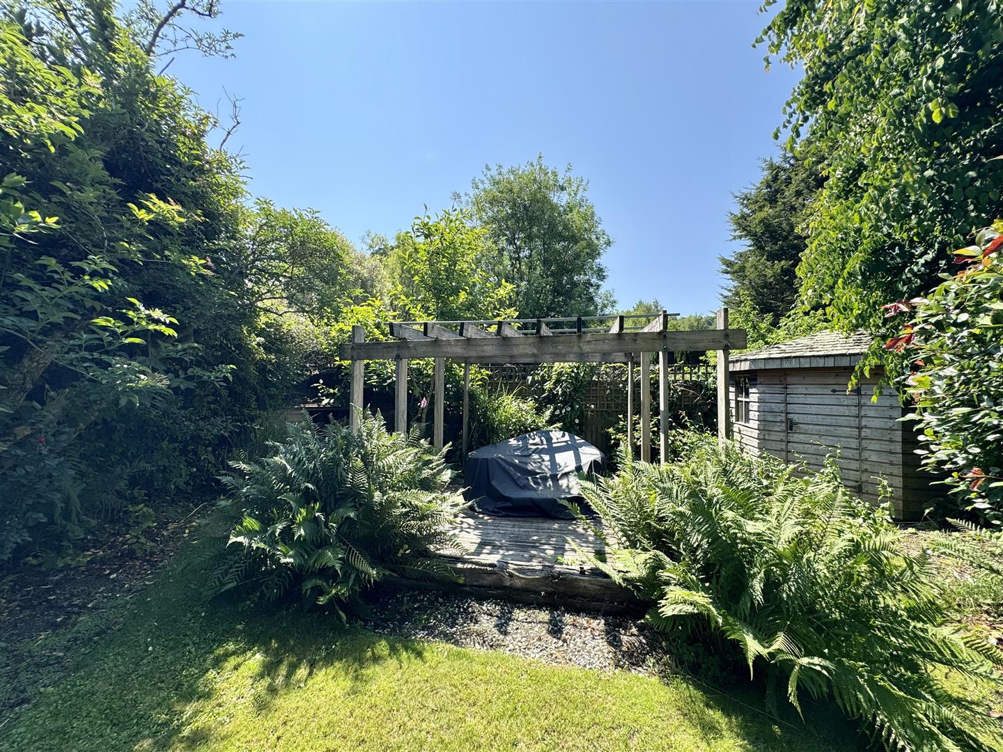 The property is approached via a public footpath/lane with a metal gate to the side opening into the property's garden. The lane continues down towards the garage and parking area. At the end of the footpath there is also access onto Mills Meadow - an enclosed, picturesque field - perfect for dog walkers and ramblers. From the decked area outside the garden room there is a raised decking area with 2 large sleepers which act as steps down to the grass area and a slate paved seating area with an outdoor pizza oven. The garden is fully enclosed ,very sunny and inviting and provides the perfect setting for entertaining. Mainly laid to lawn it contains a fascinating mixture of trees and shrubs including wisteria, honeysuckle and laurel. A stone-edged herbaceous border runs down the west side of the garden to the ancient medieval wall at the bottom. At the very bottom of the garden is a decked area with a pergola, a useful shed and a log store. There was previous planning permission for a 5m diameter round room in the garden that could be used as an extra bedroom or studio.