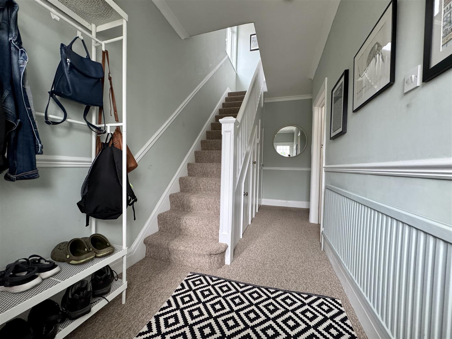Staircase rising to the first floor landing with under-stairs storage cupboards. Doors leading to the cloakroom, lounge & dining room. Dado rail. Single-glazed stained glass window with leaded light panels looks into the porch.