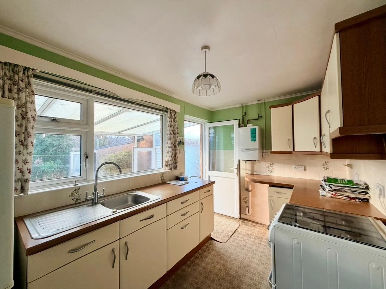 Range of base and wall-mounted cabinets with matching work surfaces and tiled splash-backs. Space for free-standing appliances. Wall-mounted Vaillant gas boiler. Cupboard housing the electric meter and fuse box. Window to the rear elevation.