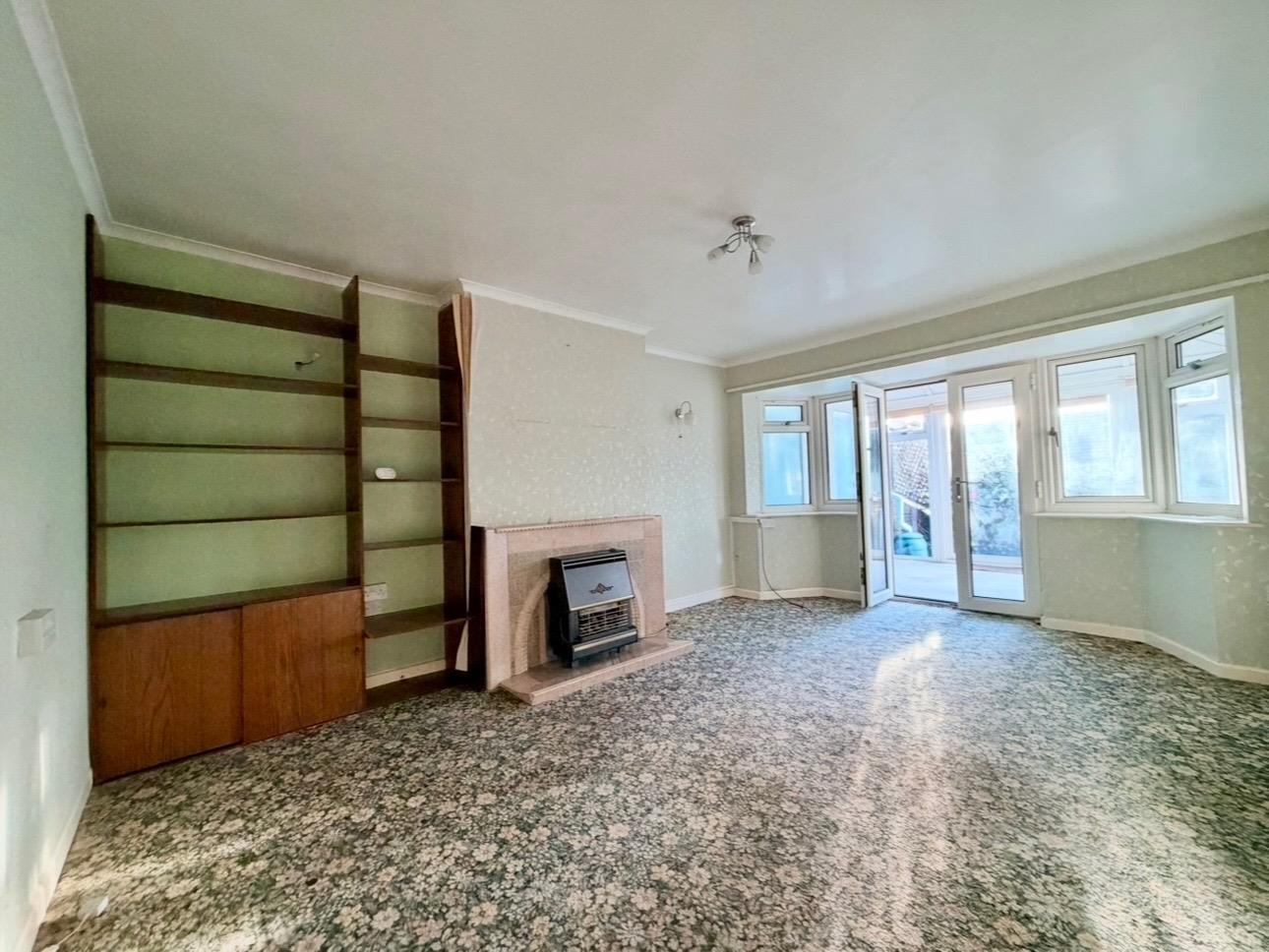 Chimney breast with a tiled fireplace, hearth and gas fire. Shelving to one side of the chimney breast. Bay window to the rear of the lounge, incorporating French doors opening into the conservatory.