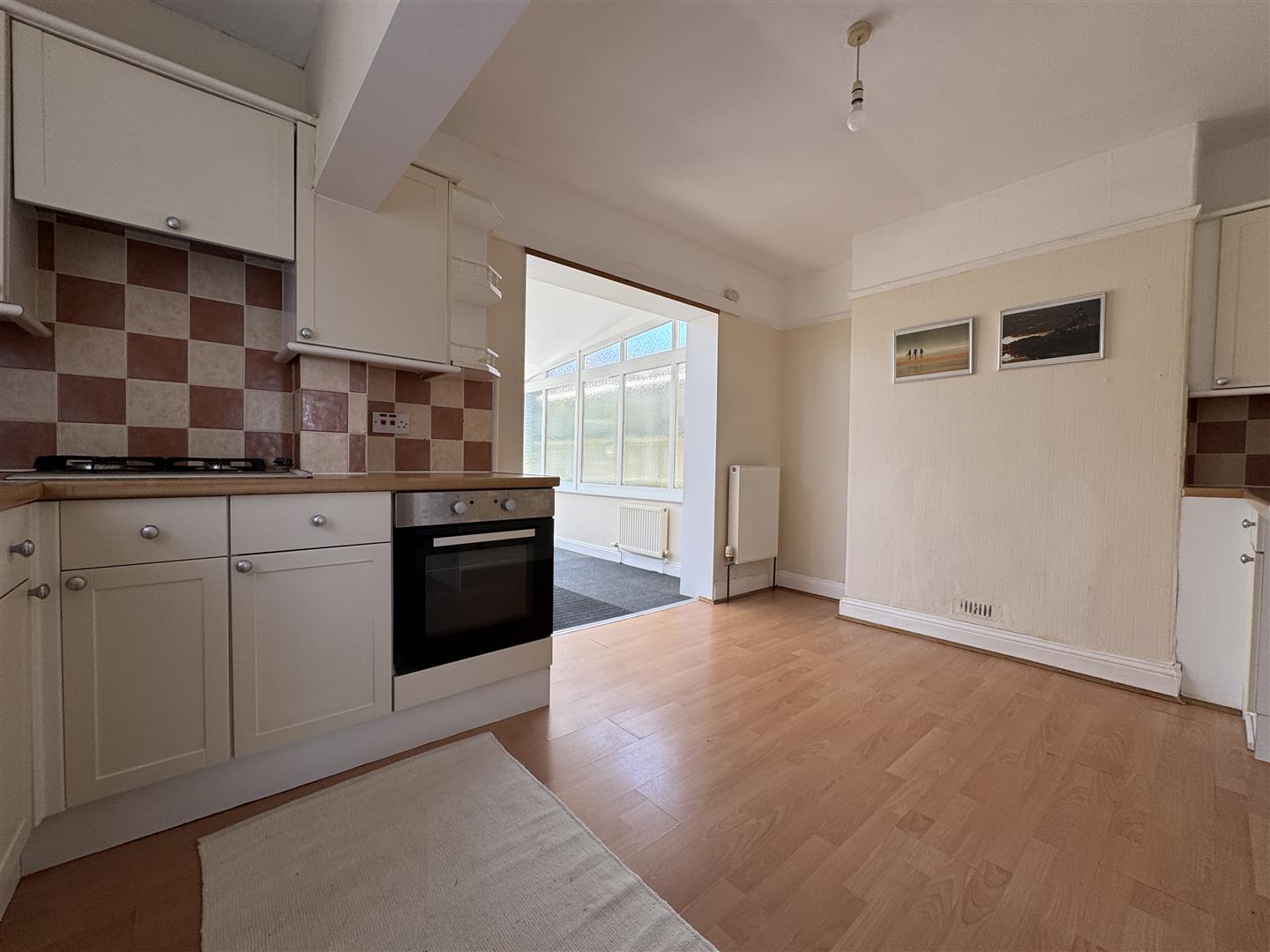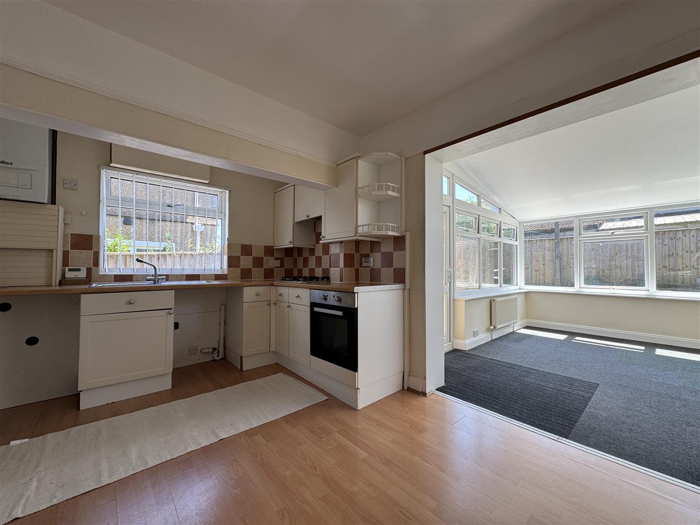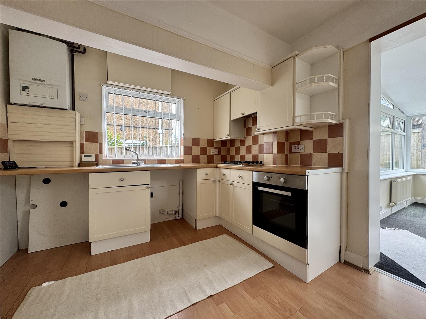Matching base & wall mounted units with integrated oven. Spaces for a washing machine & dishwasher. Separate fridge/freezer. Roll edge laminate work surfaces has inset 4 ring gas hob & stainless steel single drainer sink unit with mixer tap. Tiled splash-back. uPVC double-glazed window to the side. Wall mounted Vaillant boiler. Laminate wood flooring. Ample space for dining table. Square arch opens into garden room/dining room. Picture rail.