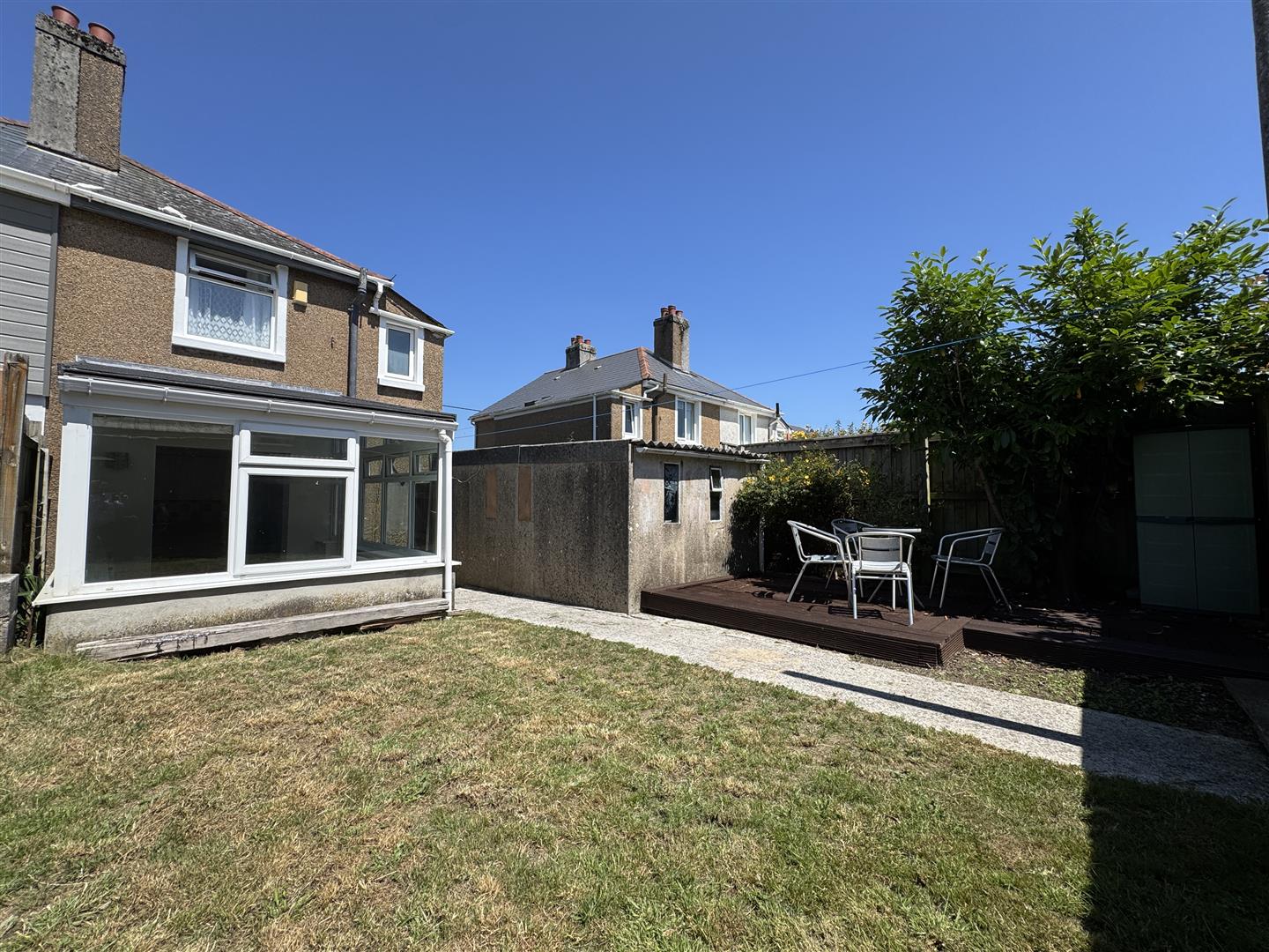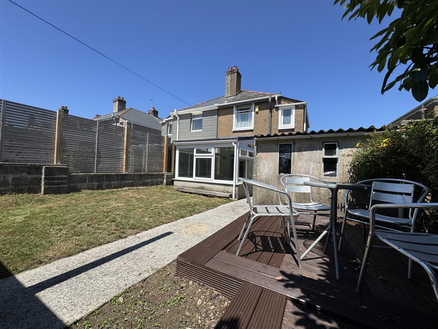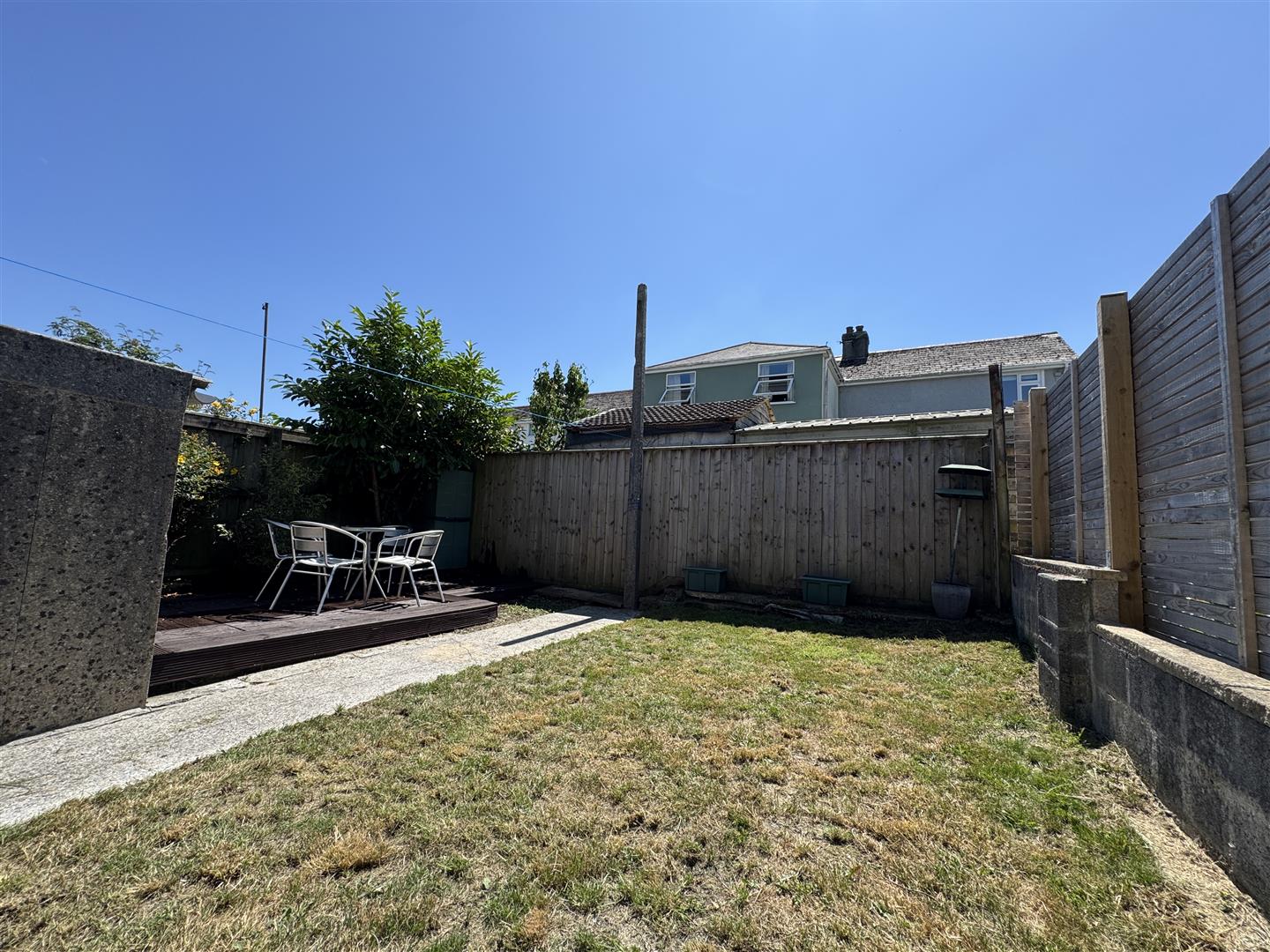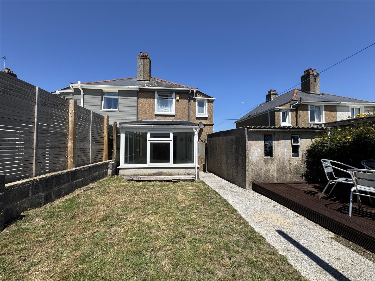 To the rear an enclosed south facing garden with wooden courtesy gate to the driveway. The main section of lawn is laid to lawn with concrete paths running down through. Bordered by a raised decked seating area.