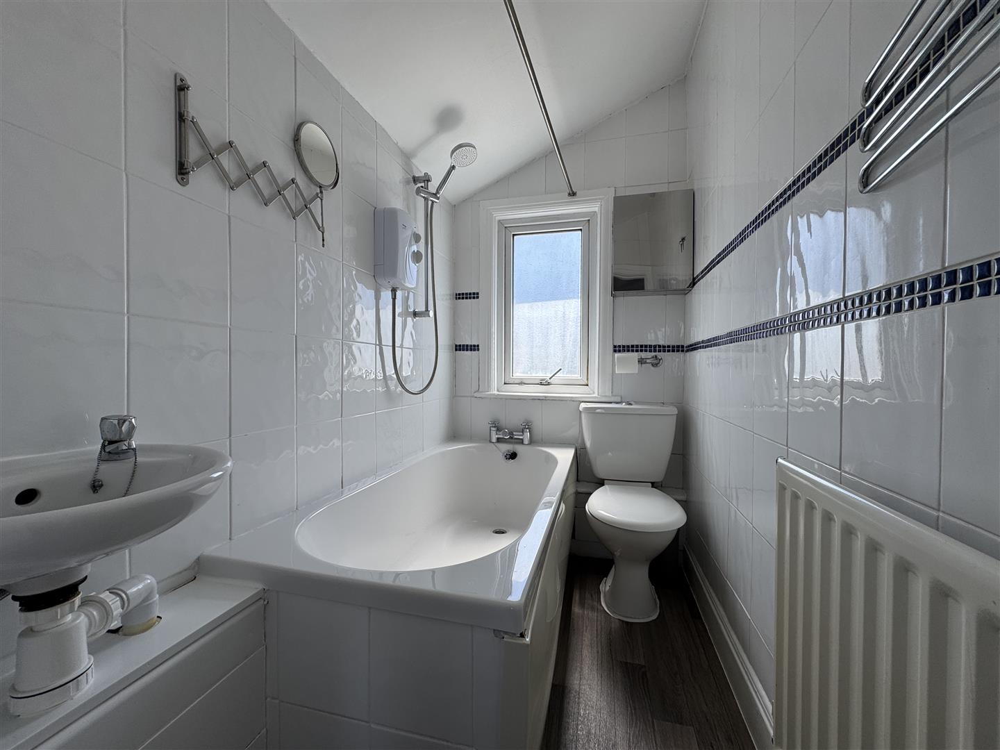 Matching suite of panelled bath with electric Triton shower over. Close coupled wc. Wall mounted wash hand basin. Tiled walls. Wood effect vinyl flooring. Obscured uPVC double-glazed window to the rear.