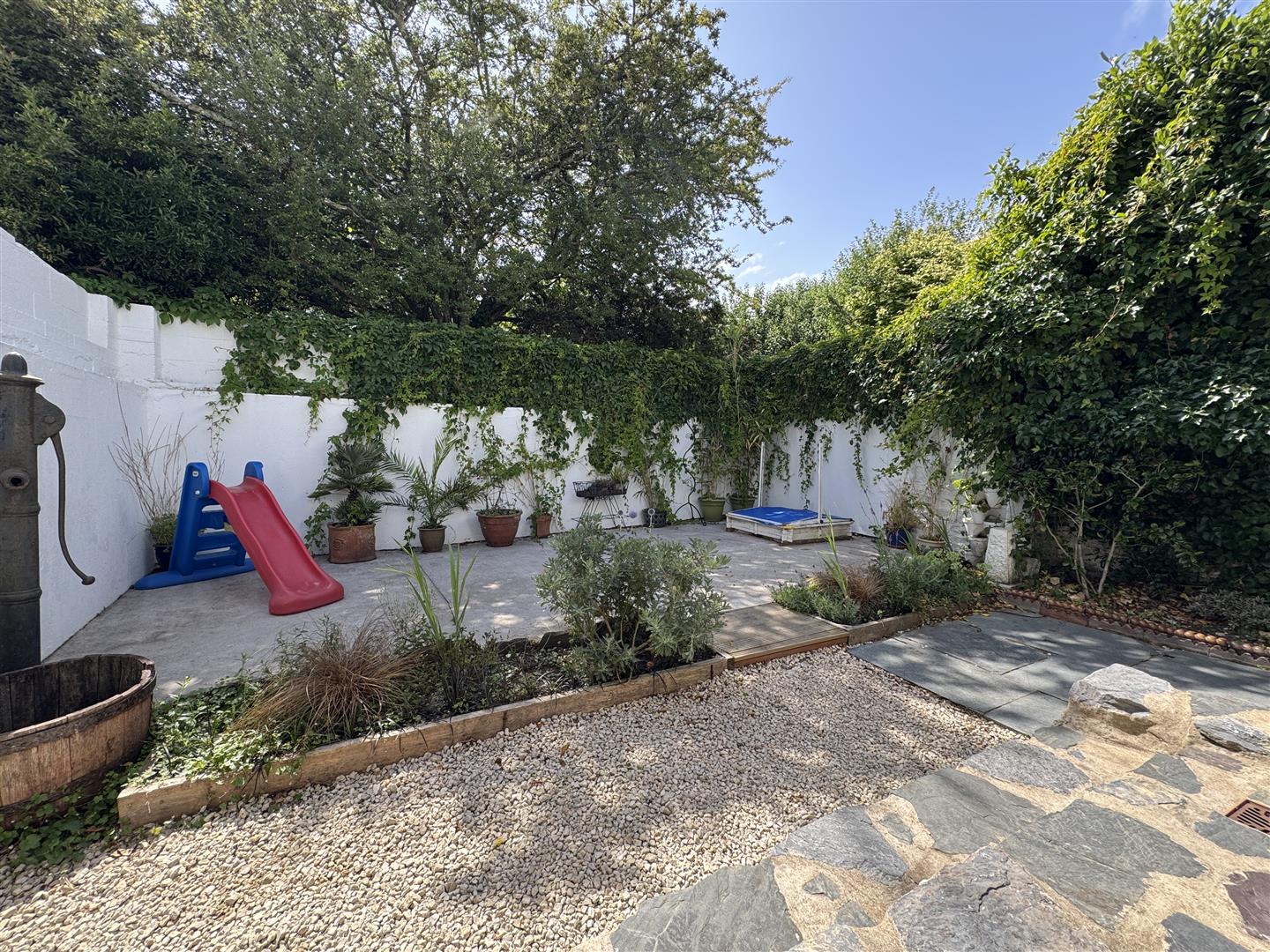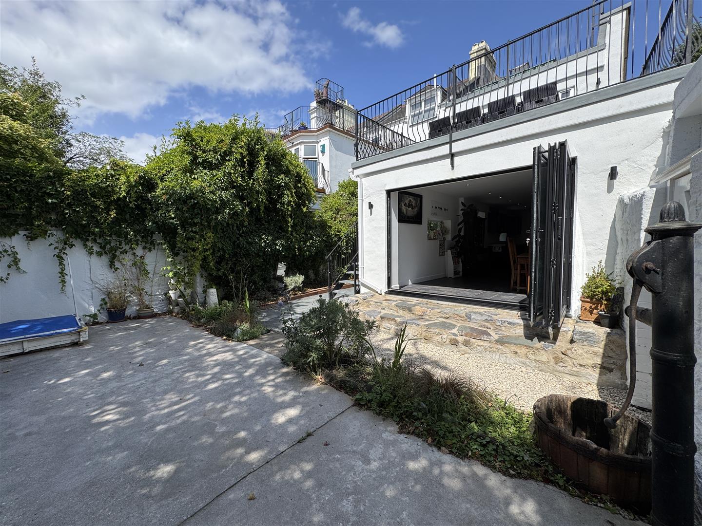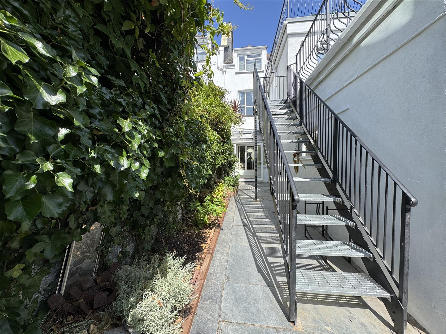 To the rear an enclosed garden which consists of a slate patio seating area, Mediterranean style courtyard garden with inset flowerbeds including mature shrubs & plants. A wooden gate gives access out to a side service lane. Wrought iron staircase with galvanised steps leads up to the first sun terrace.
