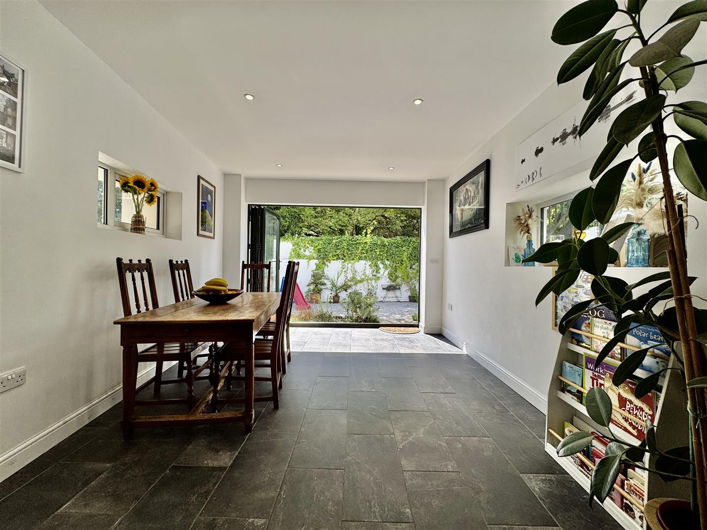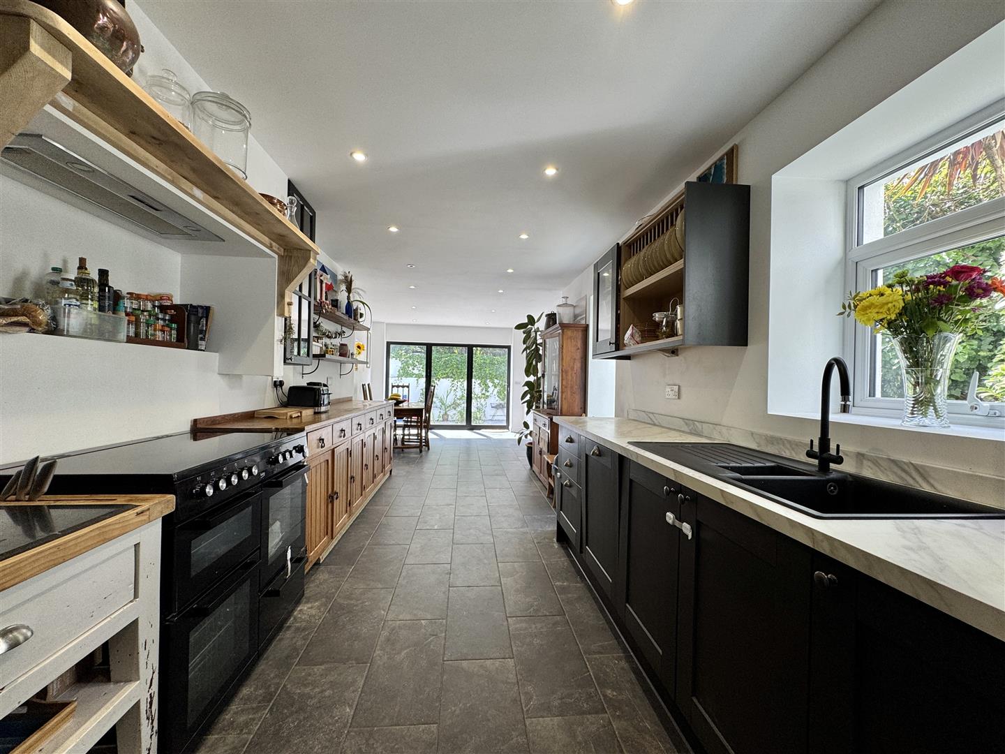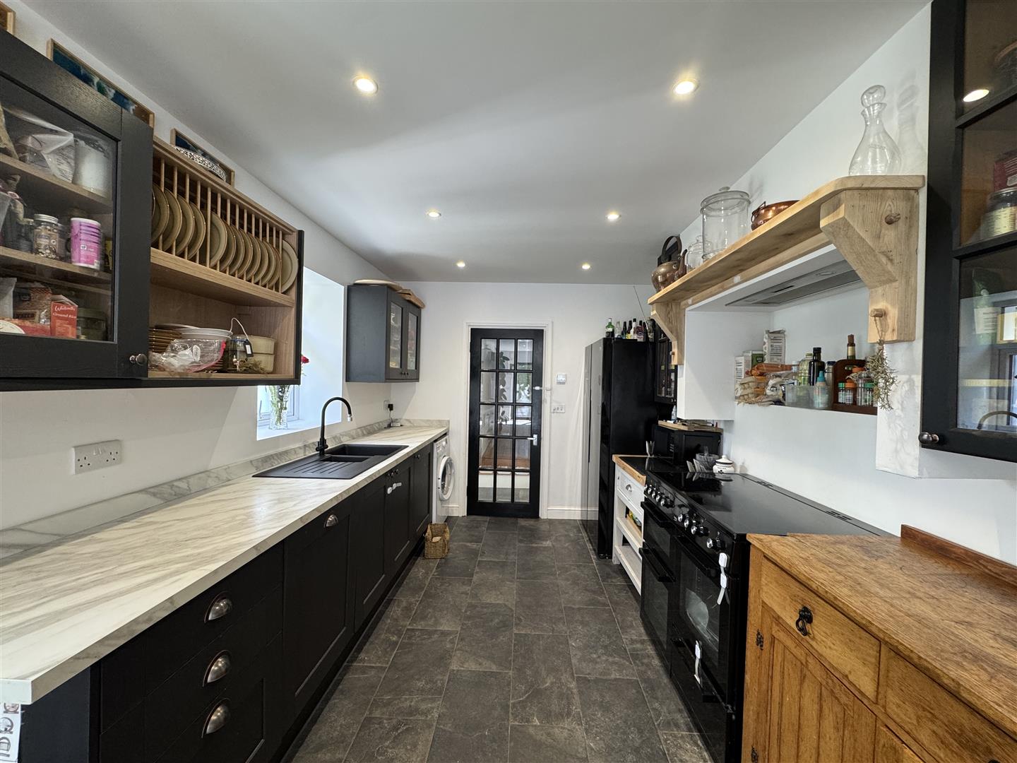 Base & wall mounted units to include space for a range cooker with extractor hood, American fridge freezer & washing machine. Integrated dishwasher. Roll edge laminate work surface has inset 1.5 bowl sink unit with a matching up stand. Triple aspect with 3 uPVC double-glazed windows to the one side & one to the other. uPVC double-glazed bi-folding doors open to the rear garden. Ceiling spotlights. Slate tiled floor.