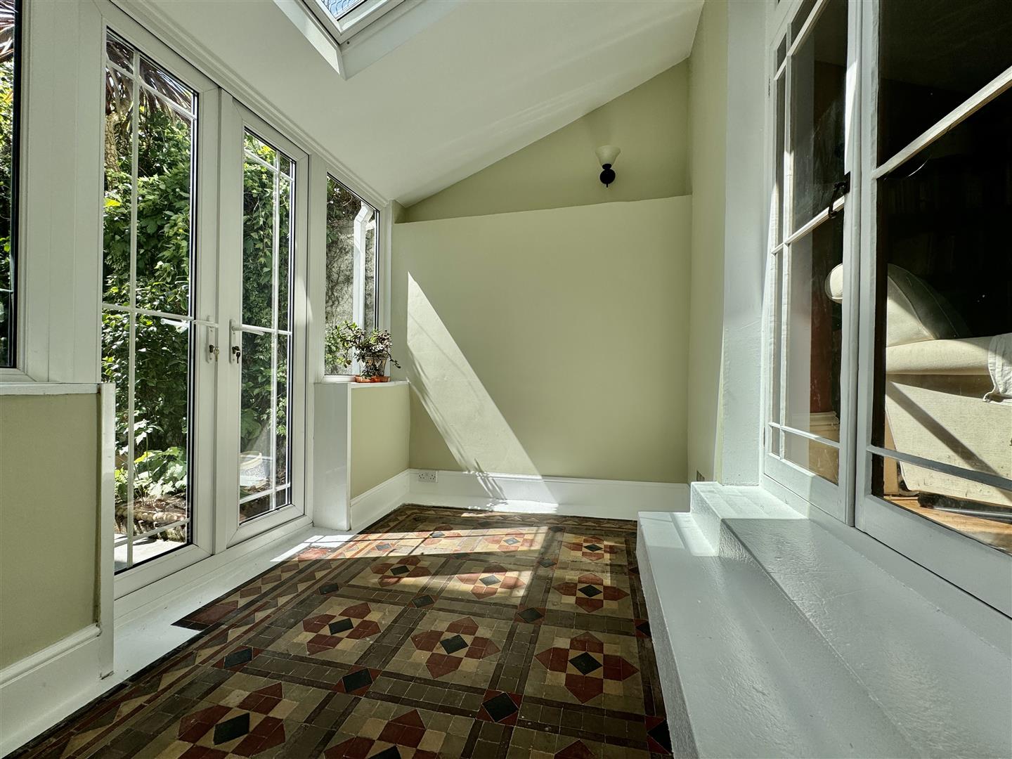 Decorative tiled floor. uPVC double-glazed French doors with uPVC double-glazed windows either side open out the garden. Velux window to the roof.