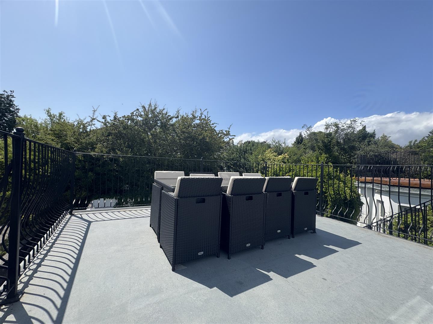 Wrought iron railings with staircase leading down to the garden. Fibreglass roof.