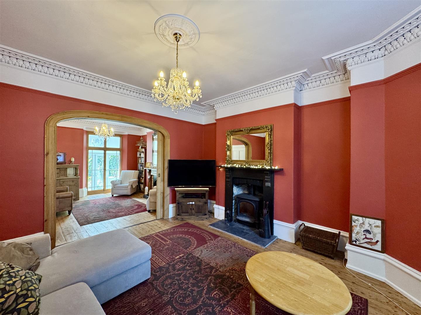 Exposed wooden floorboards. Feature fireplace with a marble hearth surround, inset wood burner & slate hearth. Ornate covings. Ceiling rose. uPVC bay window to the front. Picture rail. Twin sliding wooden doors. Archway opens into the dining room.