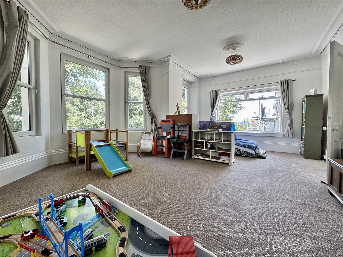 Currently acting as a playroom. uPVC double-glazed bay window to the front. uPVC double-glazed window to the front & large uPVC double-glazed window to the side. Ceiling rose. Ornate covings. Picture rail.