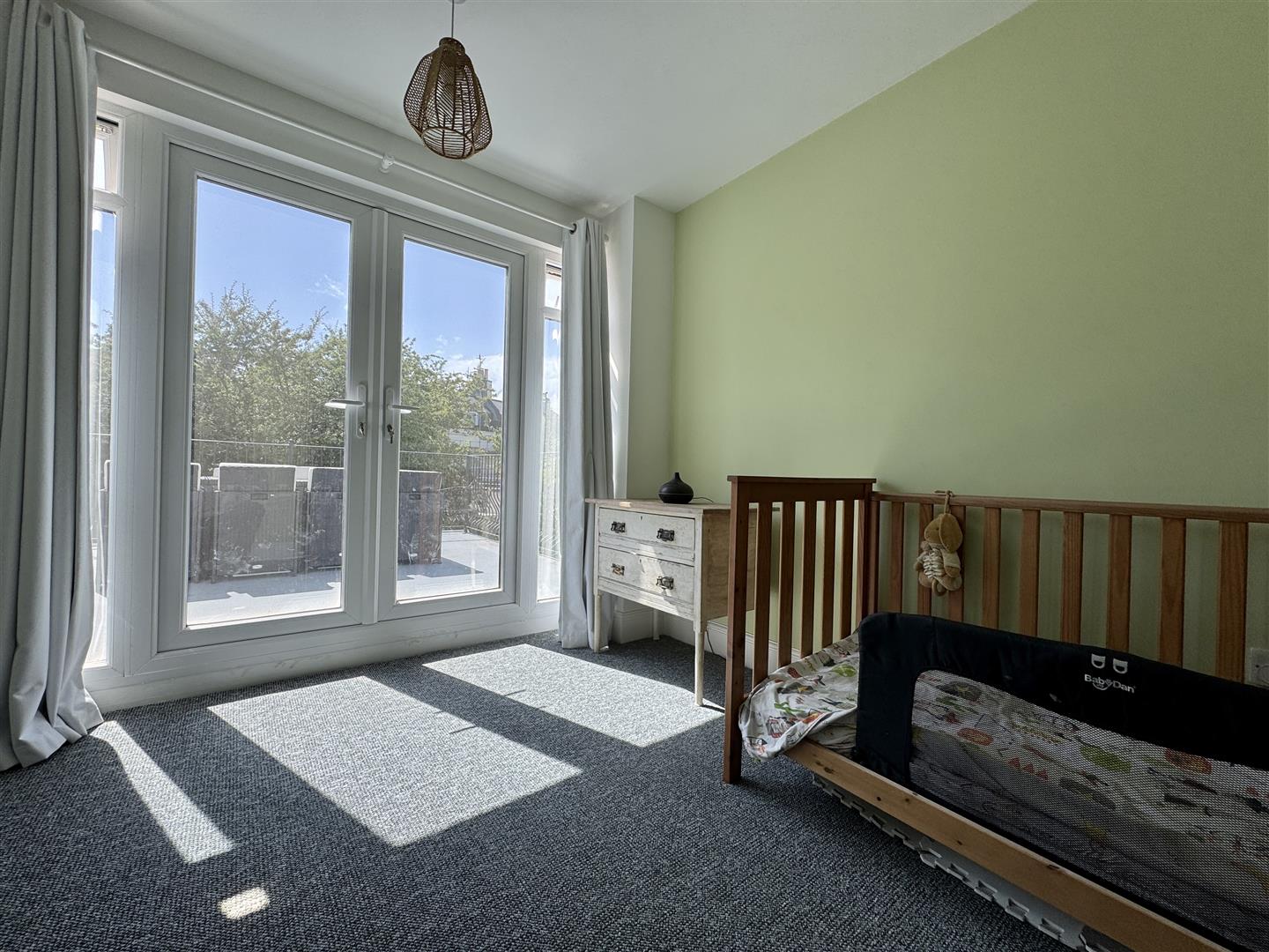 Wall mounted contemporary upright radiator. uPVC double-glazed doors with windows either side open to a roof terrace.
