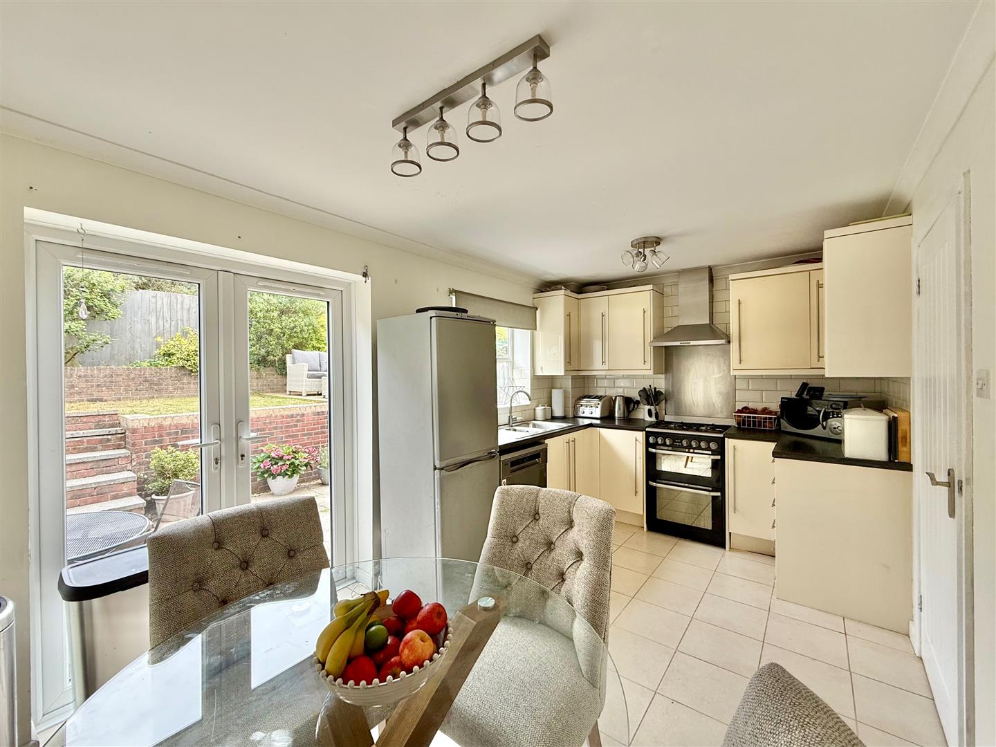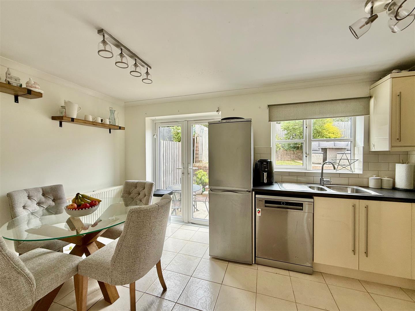 Series of matching eye-level and base units with rolled-edge work surfaces and tiled splash-backs. Inset stainless-steel one-&-a-half bowl single drainer sink unit with mixer tap. Space for a gas cooker. Space for fridge-freezer. Space and plumbing for a dishwasher. Tiled floor. Double-glazed window to the rear elevation. French-style double-glazed doors leading out onto the rear garden.