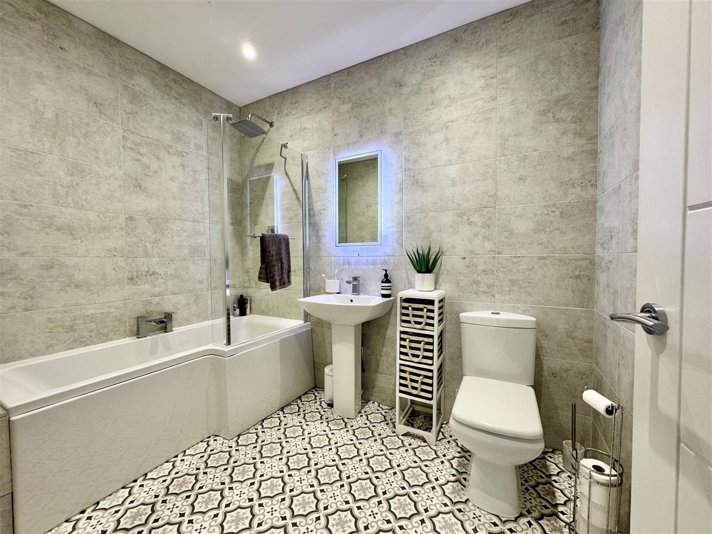 Quality-fitted bathroom with bath, wc and wash hand basin.
