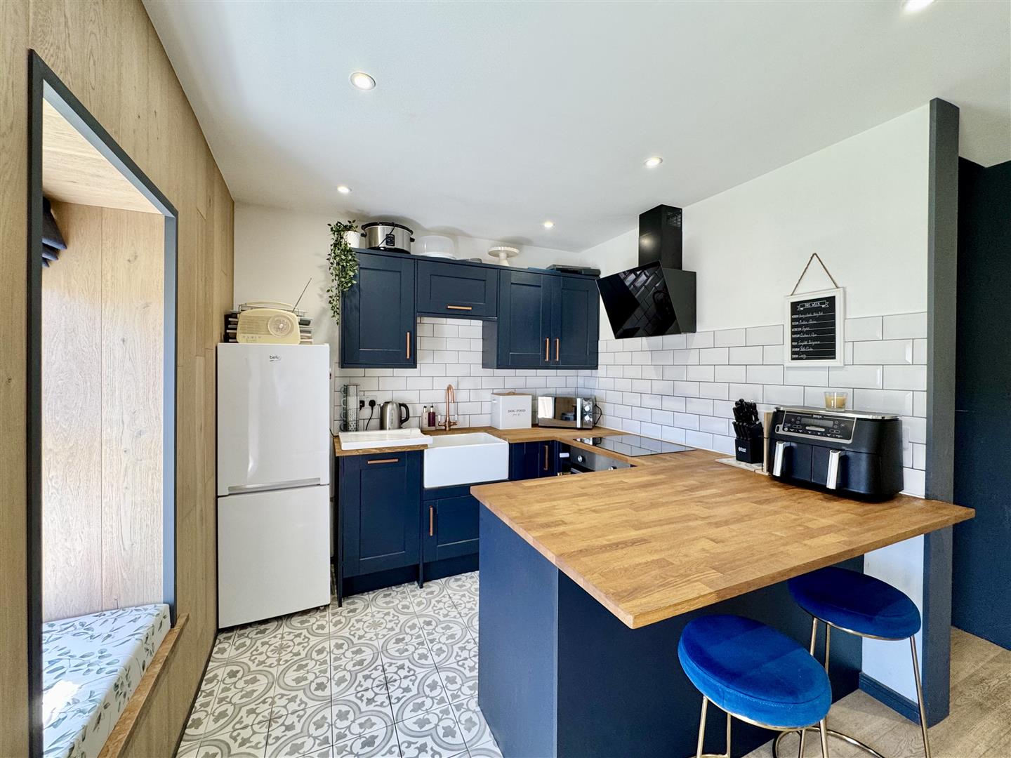 Quality modern fitted integrated kitchen with Belfast-style under-mounted sink and electric 4-ring hob with an extractor hood over and an electric oven under. Cupboard housing the Ideal gas-fired boiler servicing the central heating and domestic hot water. Window and glazed door opening to the rear garden.
