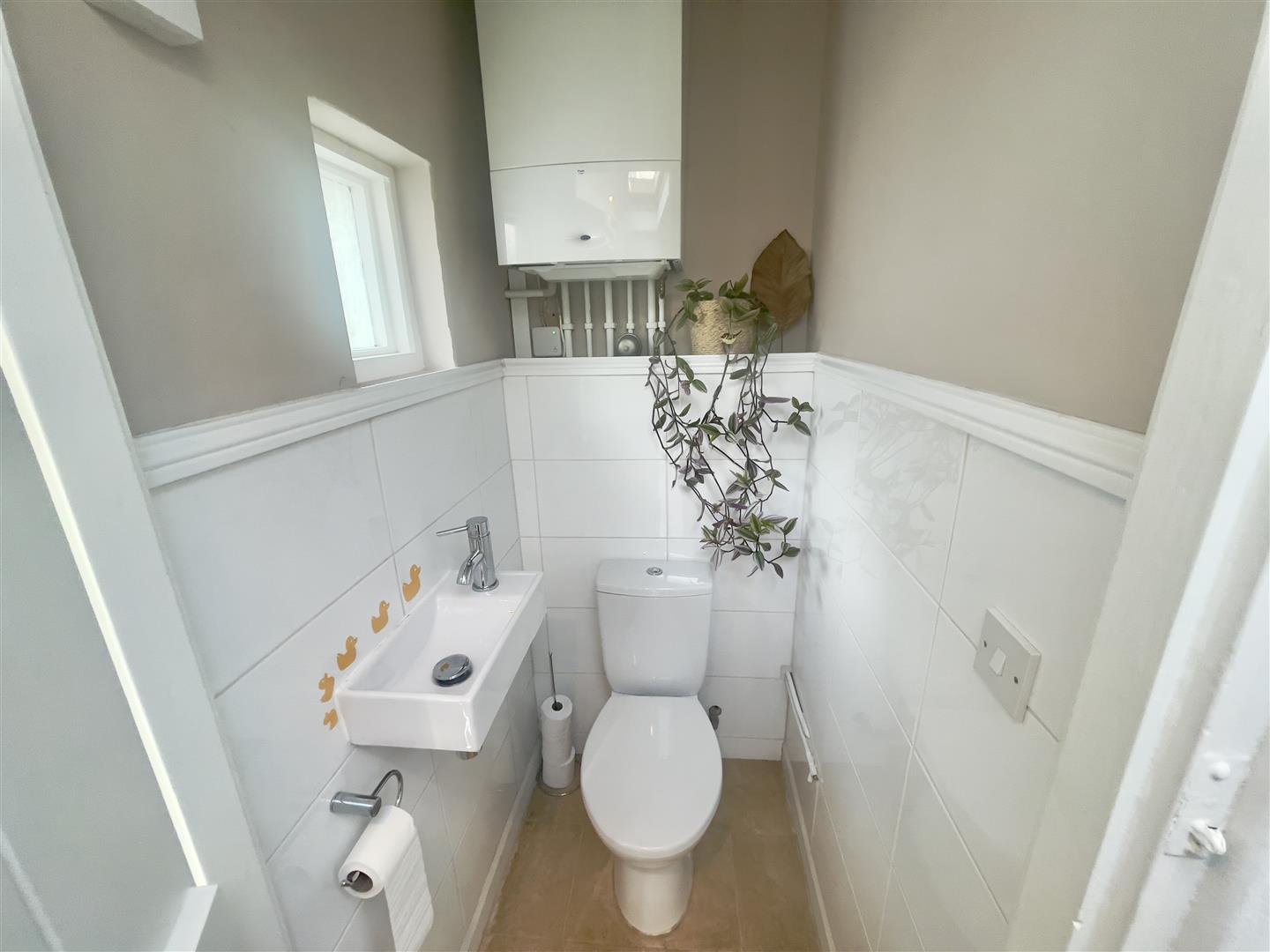 White modern wc & wash hand basin. Wall mounted Worcester boiler servicing central heating & domestic hot water.