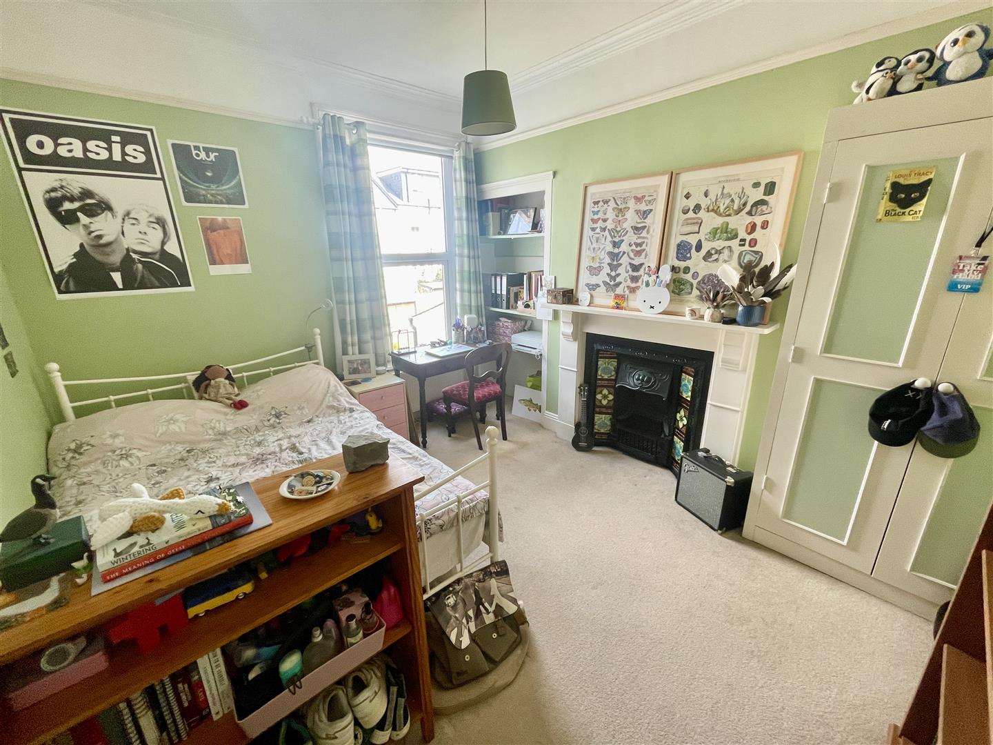 Window to the rear. Fireplace. Built-in wardrobe to one side & shelves to the other.