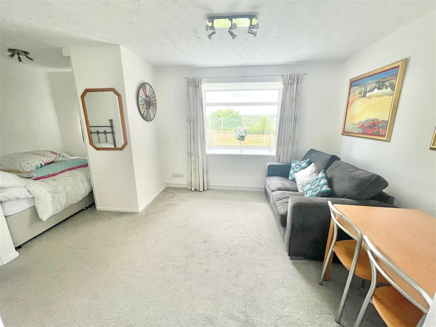Box-bay double-glazed window to the rear elevation with a lovely outlook towards Hooe Lake, the Cattewater, Plymstock and Dartmoor in the distance. Vertical wall-mounted radiator. Built-in storage cupboard housing the water heater. Opening leading into the bedroom area. Archway from the living area leading to the kitchen.