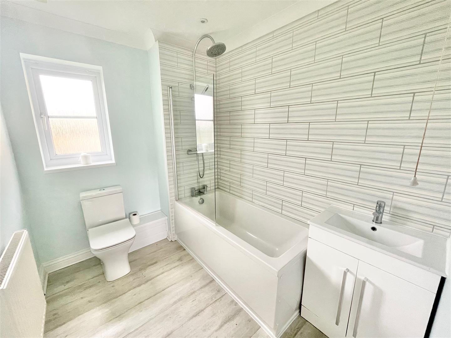 Lovely modern white suite comprising a panel bath with mixer tap, shower screen and shower unit with spray attachment with a rainfall shower head over, sink unit with a mixer tap and a cupboard beneath and a low level toilet. Built-in extractor. Obscured double-glazed window to the front elevation.