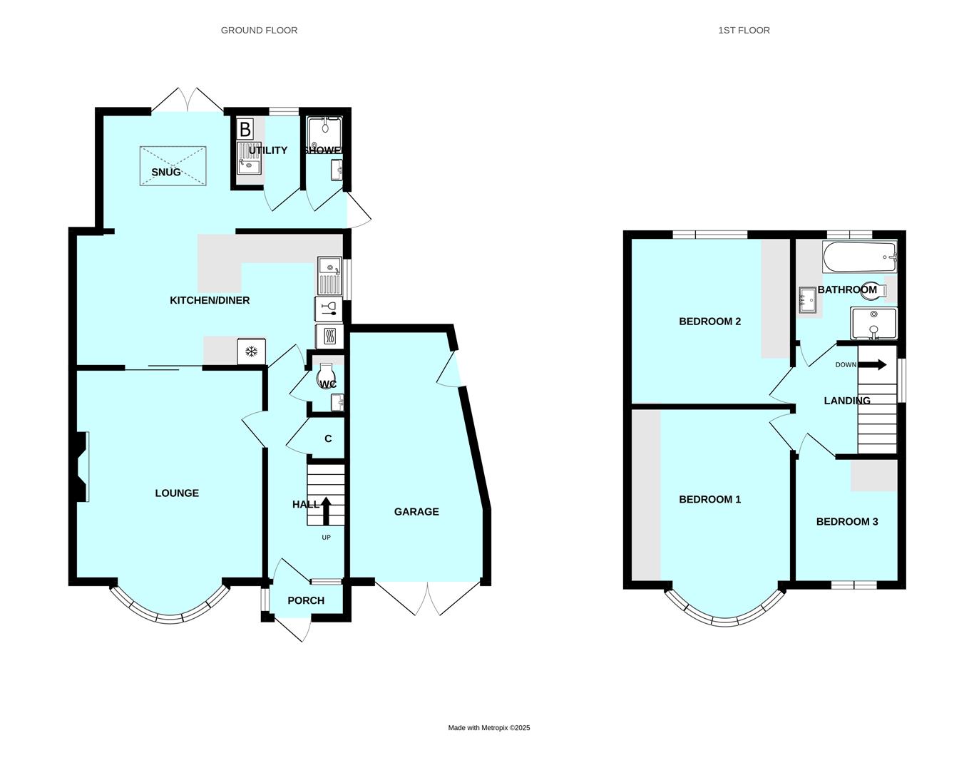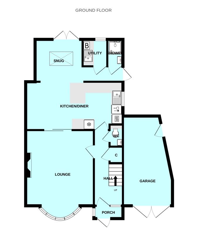 Step inside via the welcoming wood-panelled porch into a light hallway with useful under-stair storage & a cloakroom/wc. To the front, the elegant bay-fronted lounge features decorative panelling & a fireplace wired for an electric fire. Twin-glazed doors open into the expansive open-plan living space which comprises a contemporary kitchen with central island & premium integrated AEG appliances (steam oven, microwave, dishwasher, full-height fridge/freezer, & larder storage), a generous dining area, perfect for entertaining, a cosy snug with atrium window & French doors opening to the rear patio & garden. A separate utility/laundry room houses the brand-new Vaillant boiler & provides an additional sink & storage. A downstairs shower room completes the ground floor.