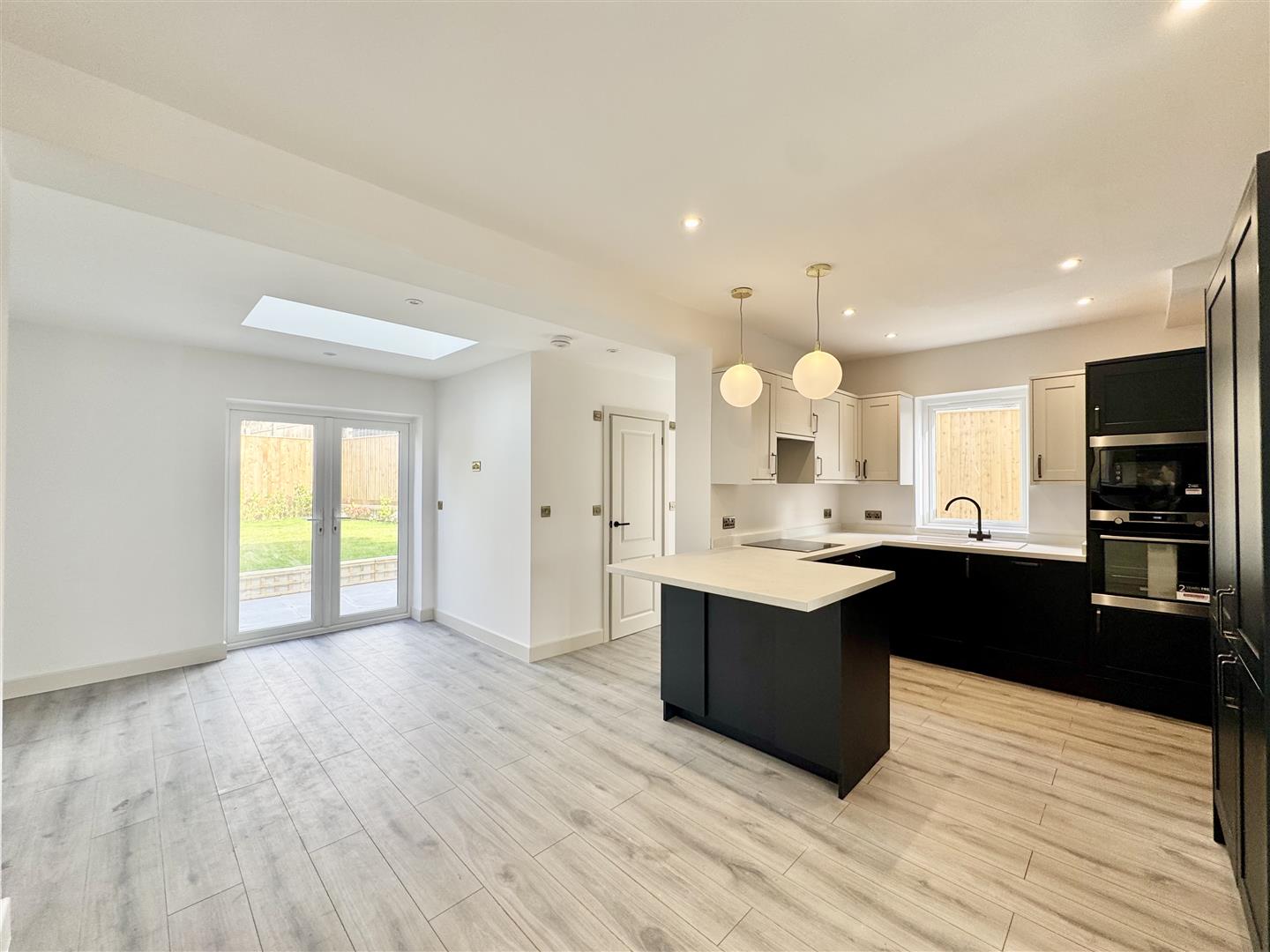 Step inside via the welcoming wood-panelled porch into a light hallway with useful under-stair storage & a cloakroom/wc. To the front, the elegant bay-fronted lounge features decorative panelling & a fireplace wired for an electric fire. Twin-glazed doors open into the expansive open-plan living space which comprises a contemporary kitchen with central island & premium integrated AEG appliances (steam oven, microwave, dishwasher, full-height fridge/freezer, & larder storage), a generous dining area, perfect for entertaining, a cosy snug with atrium window & French doors opening to the rear patio & garden. A separate utility/laundry room houses the brand-new Vaillant boiler & provides an additional sink & storage. A downstairs shower room completes the ground floor.