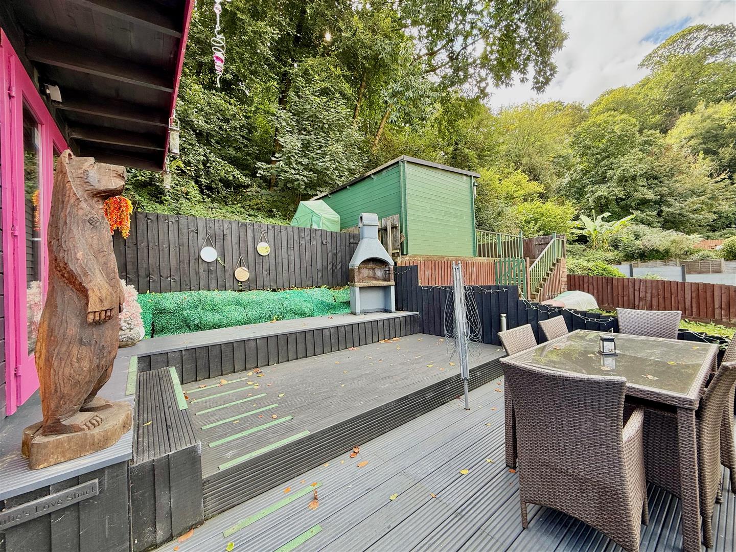 To the front there is a full-width brick-paved driveway with gates opening onto a matching brick-paved drive running alongside the house accessing the garage. A paved pathway with an outside tap leads to a patio area. Steps ascend to the remaining areas of garden, which are laid to decking and stocked with shrubs. There is a timber shed and woodland views.