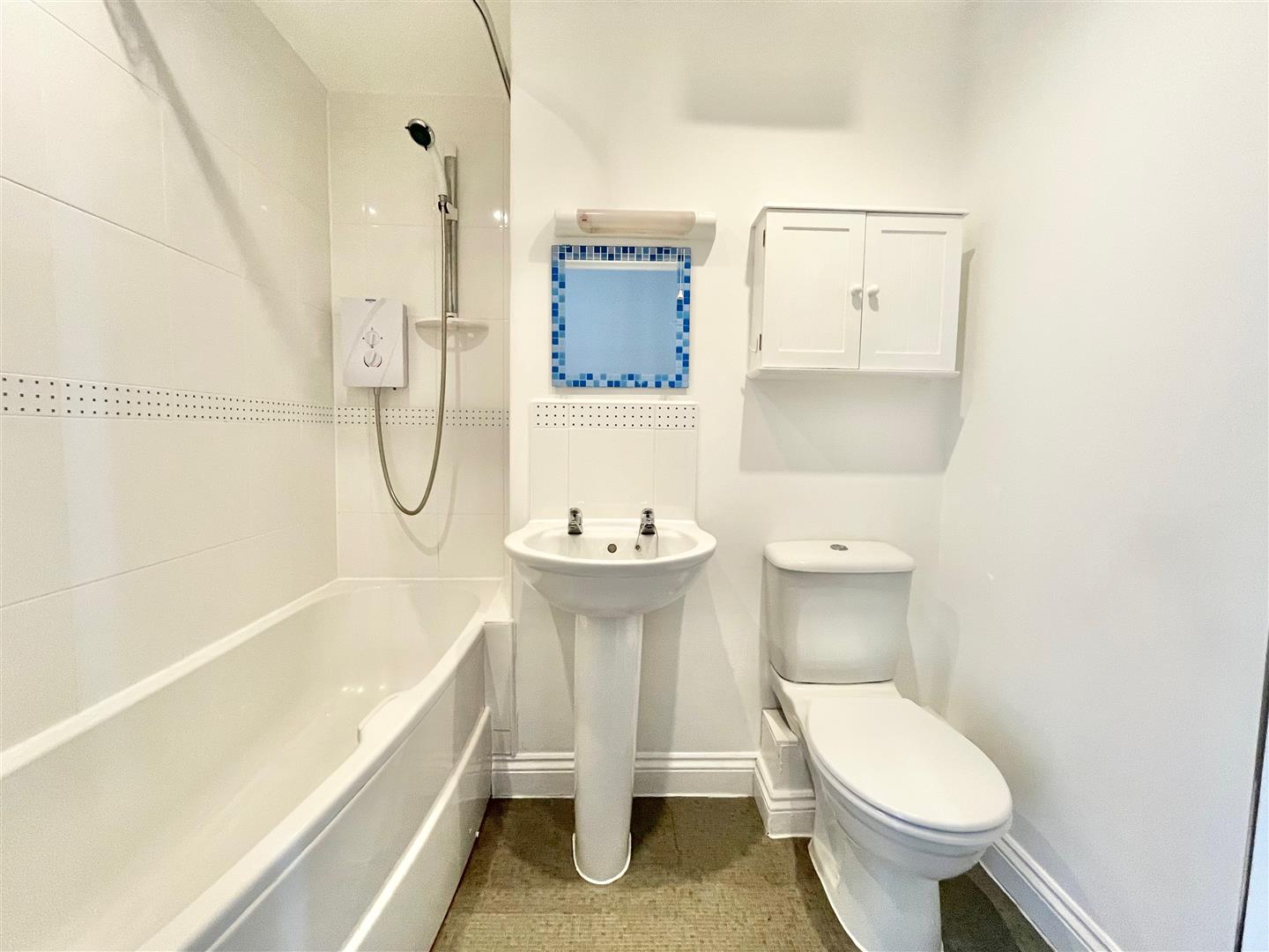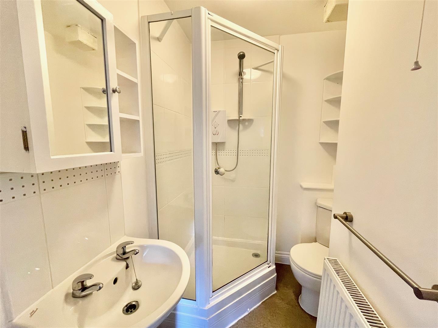 Enclosed tiled shower cubicle with a fitted shower system, pedestal wash handbasin with a tiled splash-back and wc. Extractor. Shaver point.
