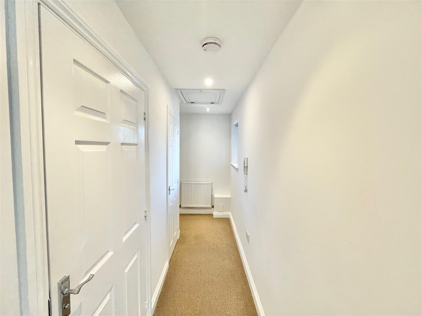 Doors providing access to the accommodation. Recessed storage cupboard. Further recessed storage cupboard housing the consumer unit. Loft access hatch. Inset ceiling spotlights. Double-glazed window with a fitted vertical blind to the side elevation.
