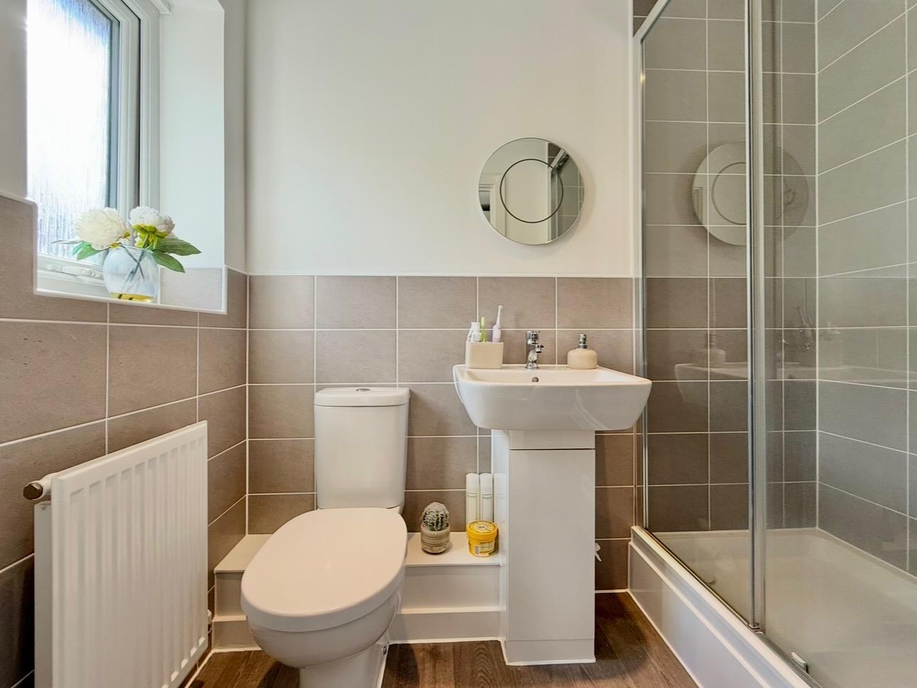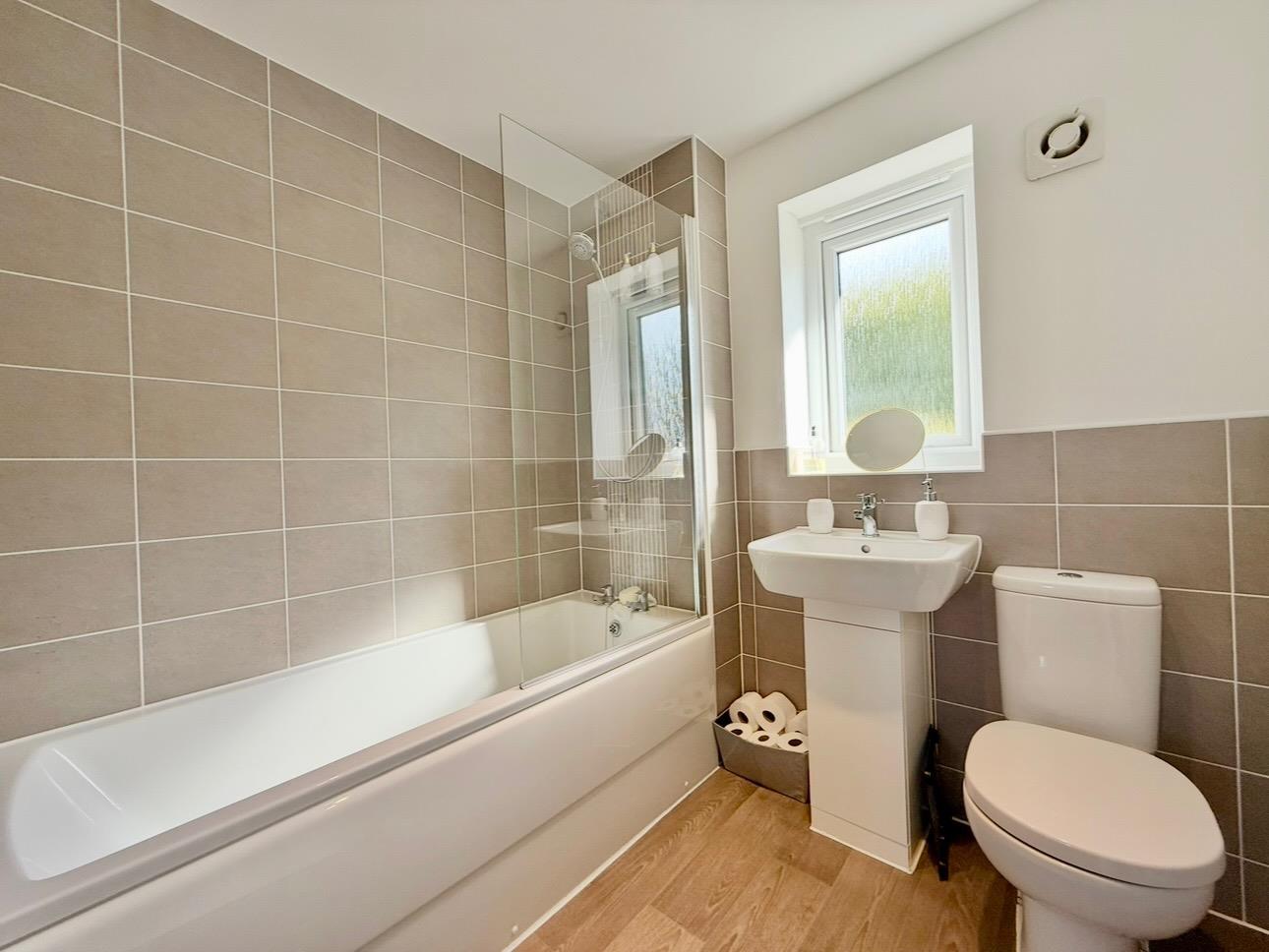 Comprising a bath with a tiled area surround, shower system over and a glass screen, basin and wc. Chrome towel rail/radiator. Partly-tiled walls. Obscured window to the front elevation.