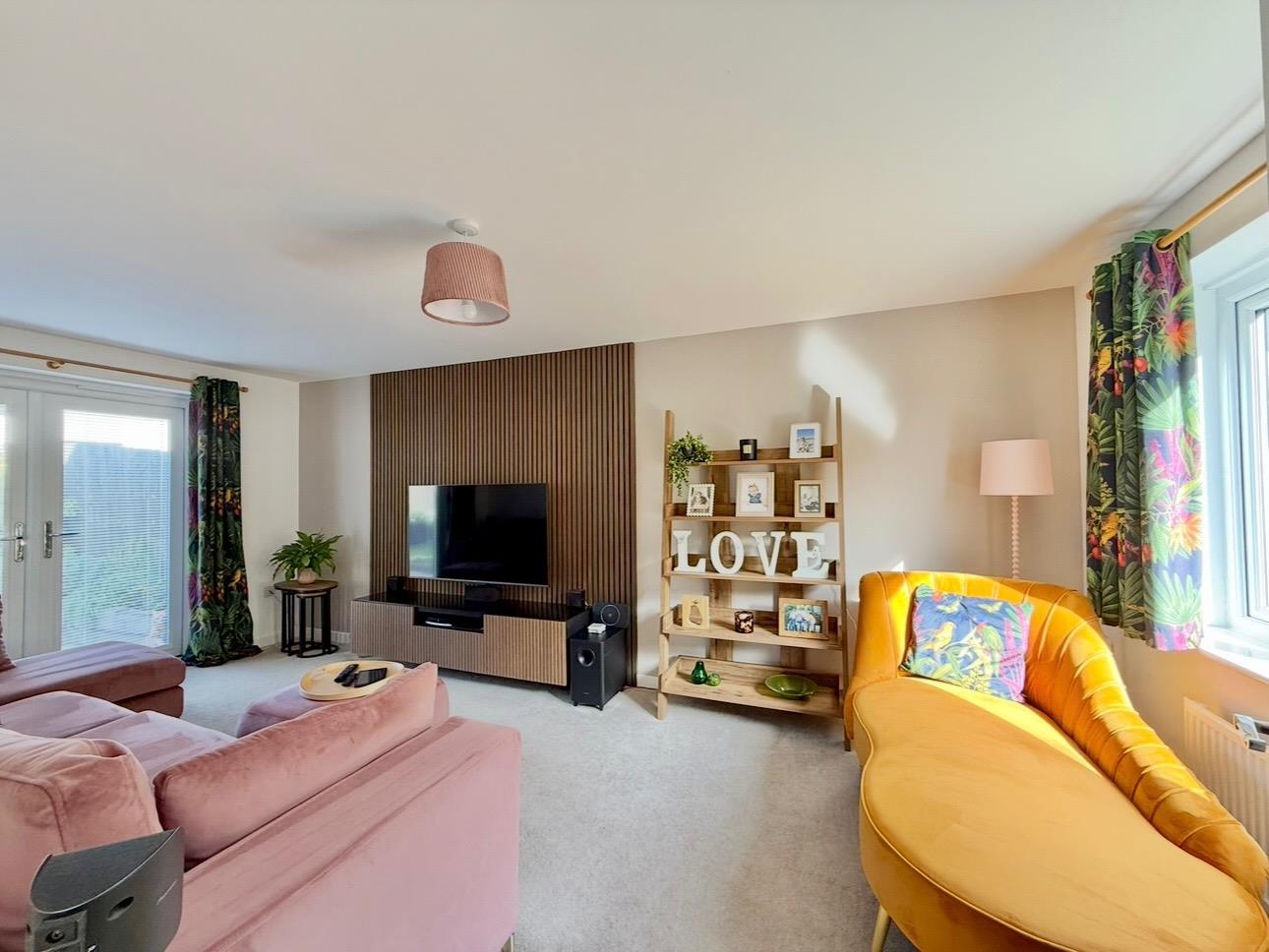 Window to the front elevation with woodland views. French doors with fitted blinds to the rear overlooking the garden and leading to outside.